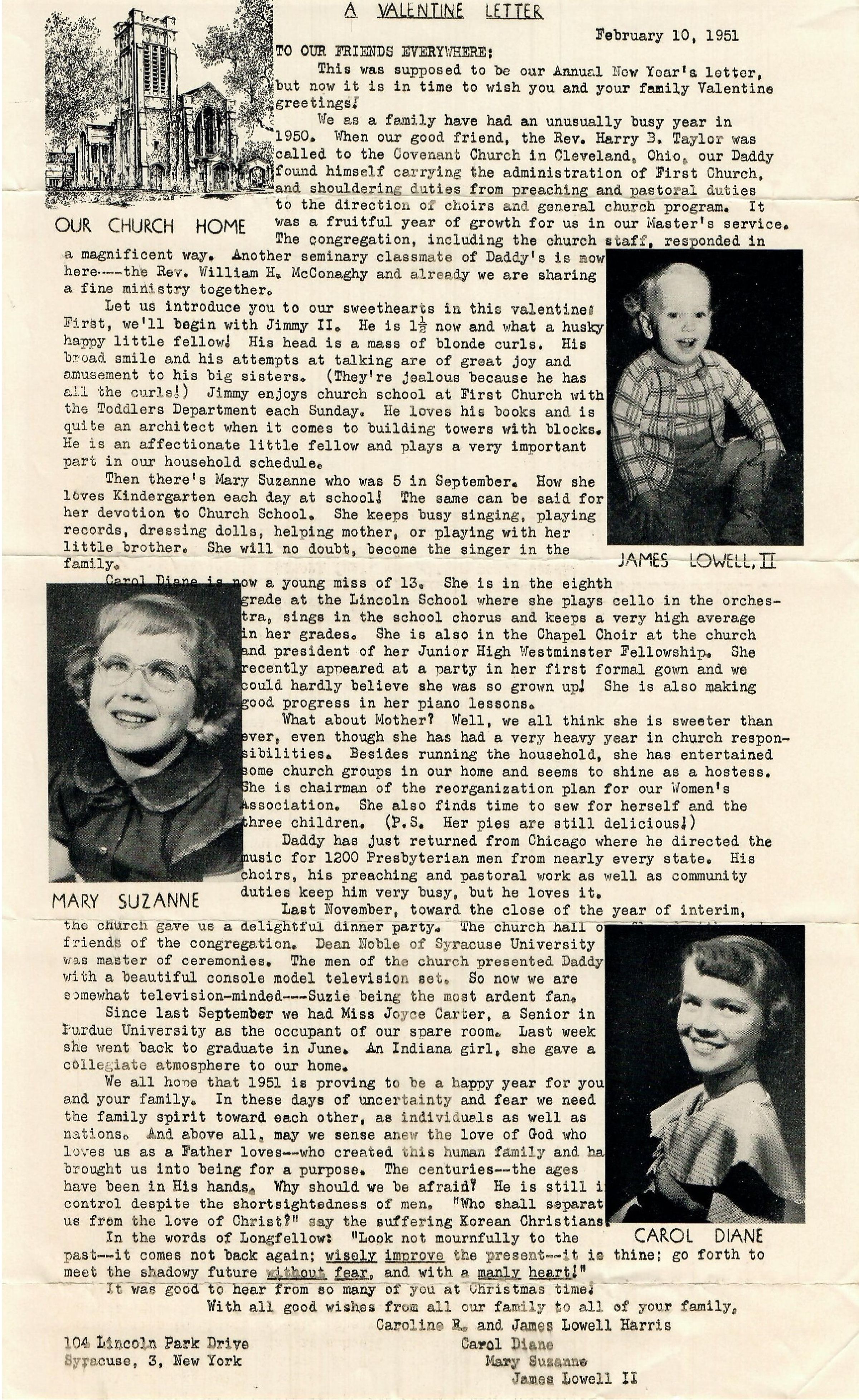 We as a family have had an unusually busy year in 1950. When our good friend, the Rev. Harry B. Taylor was called to the Covenant Church in Cleveland, Ohio, our Daddy found himself carrying the administration of First Church, and shouldering duties from preaching and pastoral duties to the direction of choirs and general church program. It was a fruitful year of growth for us in our Master's service. The congregation, including the church staff, responded in a magnificent way. Another seminary classmate of Daddy's is now here---the Rev. William H. McConaghy and already we are sharing a fine ministry together.