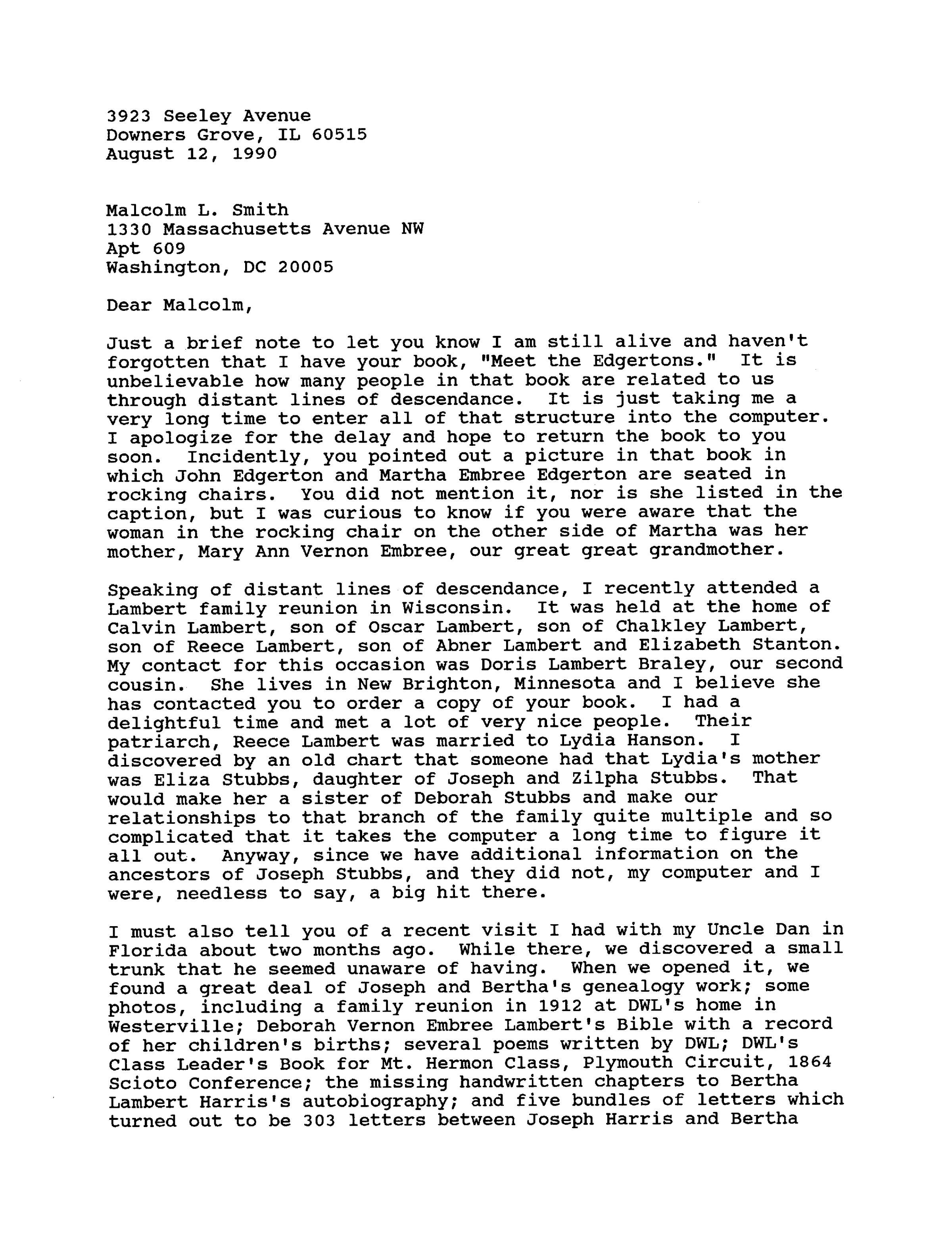 Just a brief note to let you know I am still alive and haven't forgotten that I have your book, "Meet the Edgertons." It is unbelievable how many people in that book are related to us through distant lines of descendance. It is just taking me a very long time to enter all of that structure into the computer. I apologize for the delay and hope to return the book to you soon. Incidently, you pointed out a picture in that book in which John Edgerton and Martha Embree Edgerton are seated in rocking chairs. You did not mention it, nor is she listed in the caption, but I was curious to know if you were aware that the woman in the rocking chair on the other side of Martha was her mother, Mary Ann Vernon Embree, our great great grandmother.