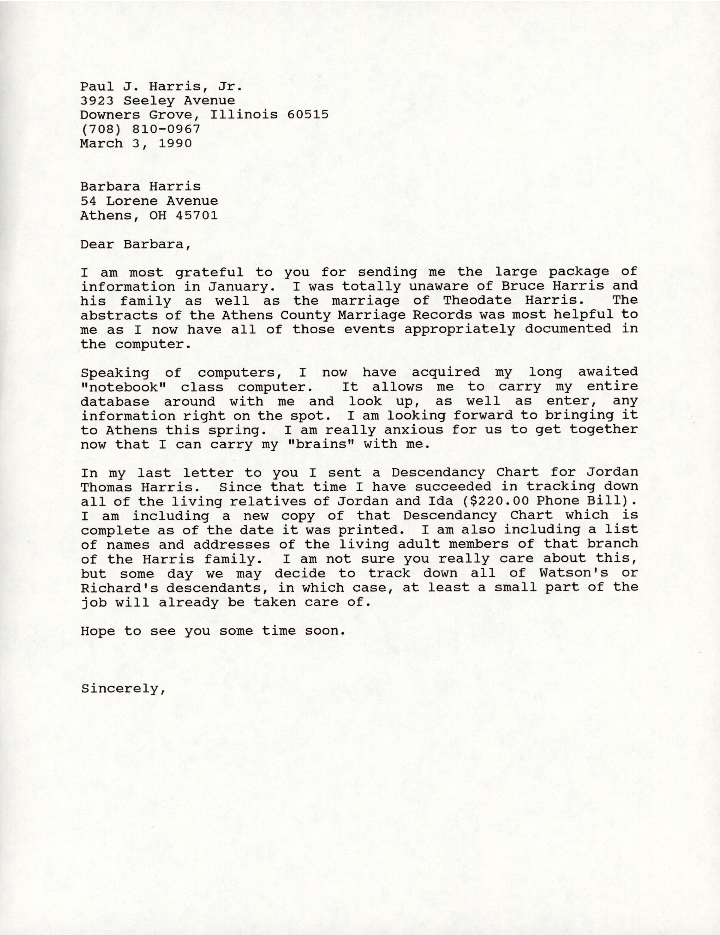 In my last letter to you I sent a Descendancy Chart for Jordan Thomas Harris. Since that time I have succeeded in tracking down all of the living relatives of Jordan and Ida ($220.00 Phone Bill). I am including 21 new copy of that Descendancy Chart which is complete as of the date it was printed. I am also including a list of names and addresses of the living adult members of that branch of the Harris family. I am not sure you really care about this, but some day we may decide to track down all of Watson's or Richard's descendants, in which case, at least a small part of the job will already be taken care of.