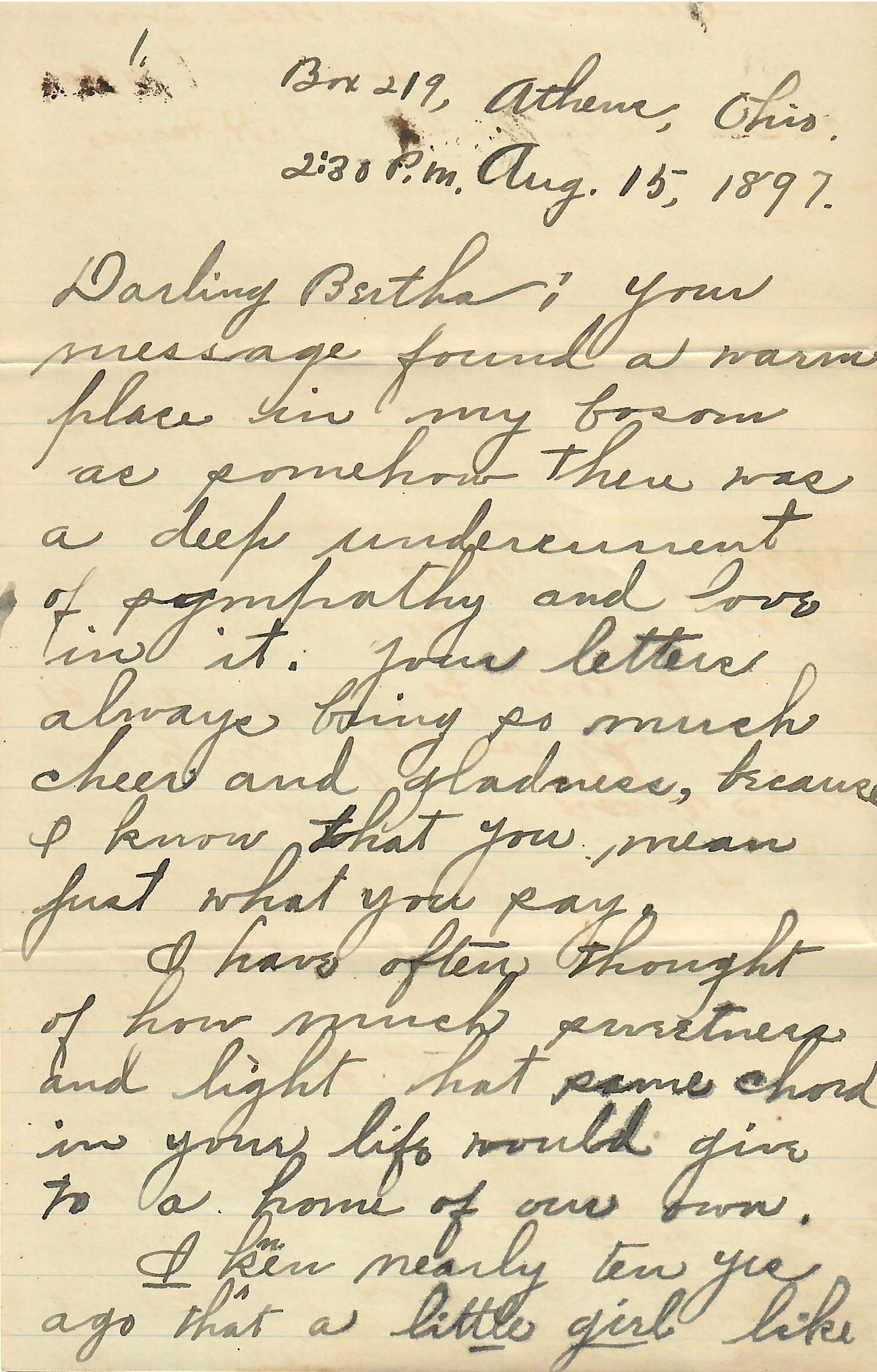 Darling Bertha: Your message found a warm place in my bosom as somehow there was a deep undercurrent of sympathy and love in it. Your letters always bring so much cheer and gladness, because I know that you mean just what you say.