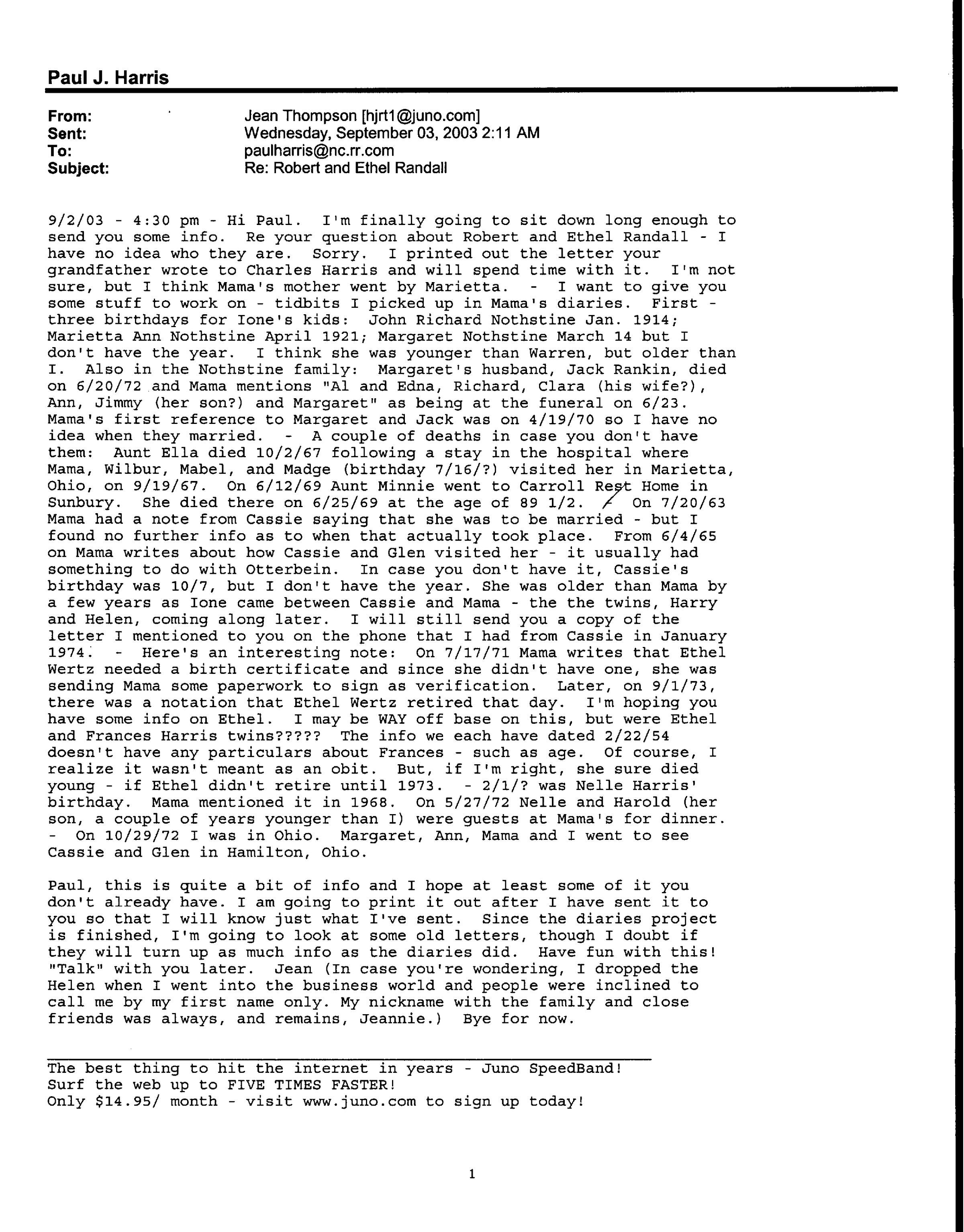 9/2/03 - 4:30 pm - Hi Paul. I'm finally going to sit down long enough to send you some info. Re your question about Robert and Ethel Randall - I have no idea who they are. Sorry. I printed out the letter your grandfather wrote to Charles Harris and will spend time with it. I'm not sure, but I think Mama's mother went by Marietta. - I want to give you some stuff to work on - tidbits I picked up in Mama's diaries. First - three birthdays for Ione's kids: John Richard Nothstine Jan. 1914; Marietta Ann Nothstine April 1921; Margaret Nothstine March 14 but I don't have the year. I think she was younger than Warren, but older than I. Also in the Nothstine family: Margaret's husband, Jack Rankin, died on 6/20/72 and Mama mentions "Al and Edna, Richard, Clara (his wife?), Ann, Jimmy (her son?) and Margaret" as being at the funeral on 6/23. Mama's first reference to Margaret and Jack was on 4/19/70 so I have no idea when they married. - A couple of deaths in case you don't have them: Aunt Ella died 10/2/67 following a stay in the hospital where Mama, Wilbur, Mabel, and Madge (birthday 7/16/?) visited her in Marietta, Ohio, on 9/19/67. ON 6/12/69 Aunt Minnie went to Carroll Rest Home in Sunbury. She died there on 6/25/69 at the age of 89 1/2. - On 7/20/63 Mama had a note from Cassie saying that she was to be married - but I found no further info as to when that actually took place. From 6/4/65 on Mama writes about how Cassie and Glen visited her - it usually had something to go with Otterbein. In case you don't have it, Cassie's birthday was 10/7, but I don't have the year. She was older than Mama by a few years as Ione came between Cassie and Mama - the[n] the twins, Harry and Helen, coming along later. I will still send you a copy of the letter I mentioned to you on the phone that I had from Cassie in January 1974. - Here's an interesting note: ON 7/17/71 Mama writes that Ethel Wertz needed a birth certificate and since she didn't have one, she was sending Mama some paperwork to sign as verification. Later, on 9/1/73, there was a notation that Ethel Wertz retired that day. I'm hoping you have some info on Ethel may be WAY off base on this, but were Ethel and Frances Harris twins????? The info we each have dated 2/22/54 doesn't have any particulars about Frances - such as age. Of course, I realize it wasn't meant as an obit. But, if I'm right, she sure died young - if Ethel didn't retire until 1973. - 2/1/? was Nelle Harris' birthday. Mama mentioned it in 1968. On 5/27/72 Nelle and Harold (her son, a couple of years younger than I) were guests at Mama's for dinner. - On 10/29/72 I was in Ohio. Margaret, Ann, Mama and I went to see Cassie and Glen in Hamilton, Ohio.