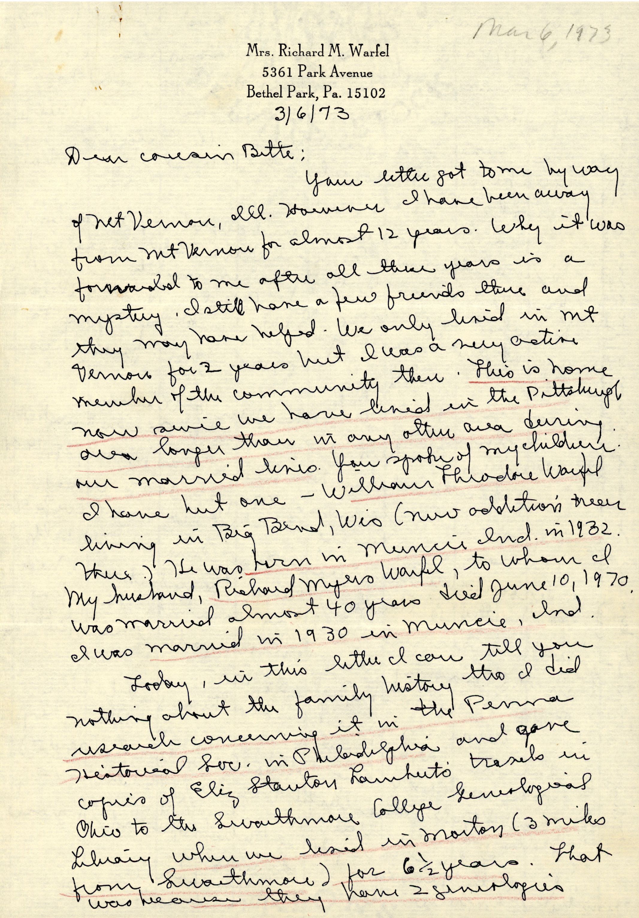Your letter got to me by way of Mt Vernon, Ill. However I have been away from Mt Vernon for almost 12 years. Why it was forwarded to me after all these years is a mystery. I still have a few friends there and they may have helped. We only lived in Mt Vernon for 2 years but I was a very active member of the community there. This is home now since we have lived in the Pittsburgh area longer than in any other area during our married lives. You spoke of my children. I have but one - William Theodore Warfel living in Big Bend, Wis (New addition near there). He was born in Muncie Ind. in 1932. My husband, Richard Myers Warfel, to whom I was married almost 40 years died June 10, 1970. I was married in 1930 in Muncie, Ind. Lookey, in this letter I can tell you nothing about the family history tho I did research concerning it in the Penna Historical Soc. in Philadelphia and gave copies of Eliz Stanton Lambert's travels in Ohio to the Swarthmore College Genealogical Library when we lived in Morton (3 miles from Swarthmore) for 6 1/2 years. That was because they have 2 genealogies