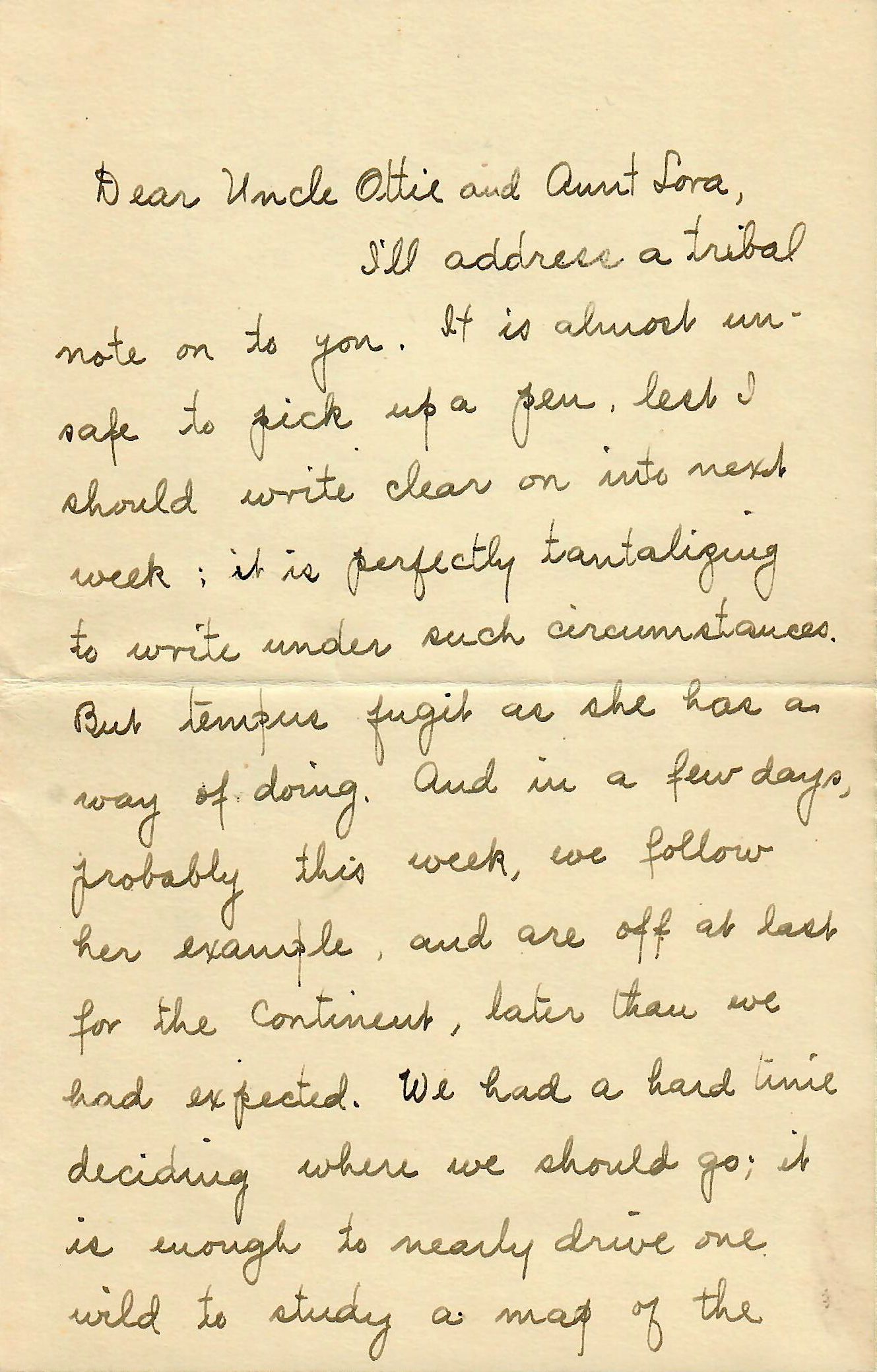 I'll address a tribal note on to you. It is almost unsafe to pick up a pen lest I should write clear on into next week; it is perfectly tantalizing to write under such circumstances. But tempus fugit as she has a way of doing. And in a few days, probably this week, we follow her example, and are off at last for the continent, later than we had expected. We had a hard time deciding where we should go; it is enough to nearly drive one wild to study a map of the "neighborhood" over here; it seems the whole world is at your door, and one wants everything in sight. But they tell us we have decided upon a rich little trip; how is this: Across to Holland first, Rotterdam, The Hague, Amsterdam and Utrecht, then down to Cologne, Frankfurt, Heidelberg, Nuremberg, Munich, Innsbruck, through the Tyrolean Alps (alas, we cannot scale an Alp at this time of year) to Venice, Bologna, Florence, Pisa, Genoa, Milan, through Switzerland lengthwise, Lucerne, Bale, then on to Paris and home to London via Rouen & Dieppe. It will take about four or five weeks unless we stop at Heidelberg or Munich to work a while. We gave up pushing on to Berlin. I am sorry chiefly on account of missing cousin Earl whom we had counted on looking up there. I was going to write to his mother, but have forgotten her address, so would you be so kind as to tell her for me some time? We are disappointed, for Arthur and I had counted on a pleasant time with him in the land of strangers. I hope his time is as happy as ours.