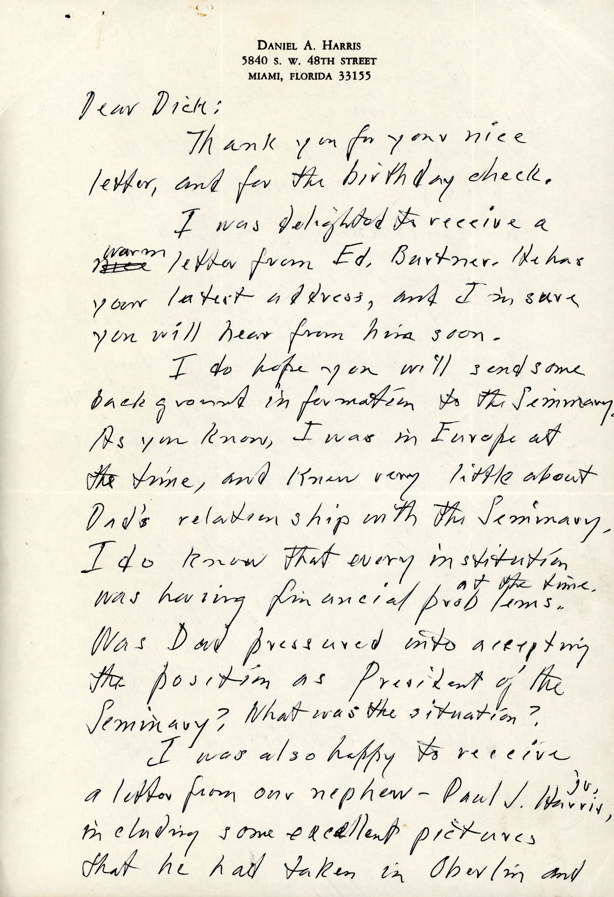 I do hope you will send some background information to the Seminary. As you know, I was in Europe at the time, and knew very little about Dad's relationship with the Seminary. I do know that every institution was having financial problems at the time. Was Dad pressured into accepting the position as President of the Seminary? What was the situation?