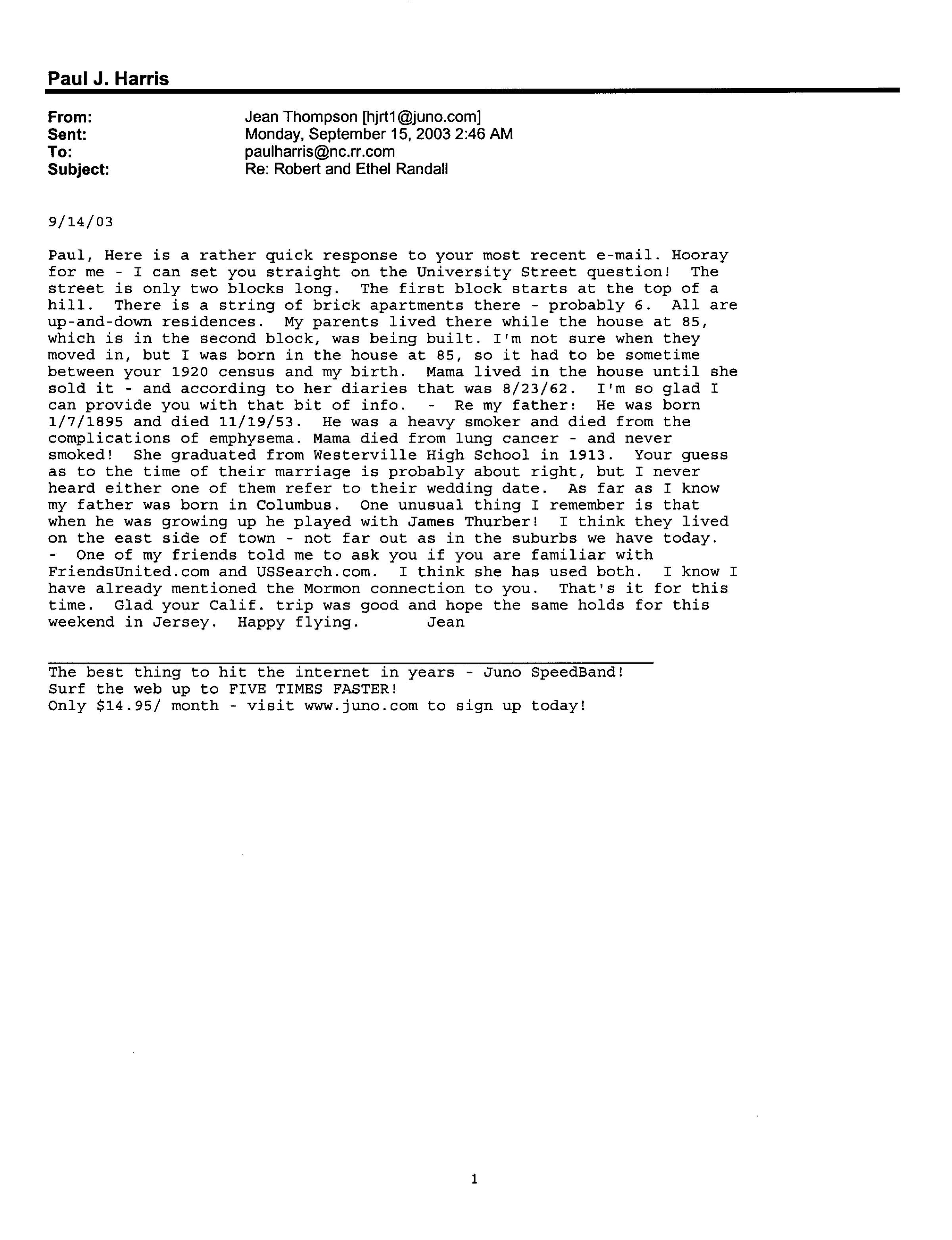 Paul, Here is a rather quick response to your most recent e-mail. Hooray for me - I can set you straight on the University Street question! The street is only two blocks long. The first block starts at the top of a hill. There is a string of brick apartments there - probably 6. All are up-and-down residences. My parents lived there while the house at 85, which is in the second block, was being built. I'm not sure when they moved in, but I was born in the house at 85, so it had to be sometime between you 1920 census and my birth. Mama lived in the house until she sold it - and according to her diaries that was 8/23/62. I'm so glad I can provide you with that bit of info. - Re my father: He was born 1/7/1895 and died 11/19/53. He was a heavy smoker and died from the complications of emphysema. Mama died from lung cancer - and never smoked! She graduated from Westerville High School in 1913. Your guess as to the time of their marriage is probably about right, but I never heard either one of them refer to their wedding date. As far as I know my father was born in Columbus. One unusual thing I remember is that when he was growing up he played with James Thurber! I think they lived on the east side of town - not far out as in the suburbs we have today. - One of my friends told me to ask you if you are familiar with FriendsUnited.com and USSearch.com. I think she has used both. I know I have already mentioned the Mormon connection to you. That's it for this time. Glad your Calif. trip was good and hope the same holds for this weekend in Jersey. Happy flying. Jean