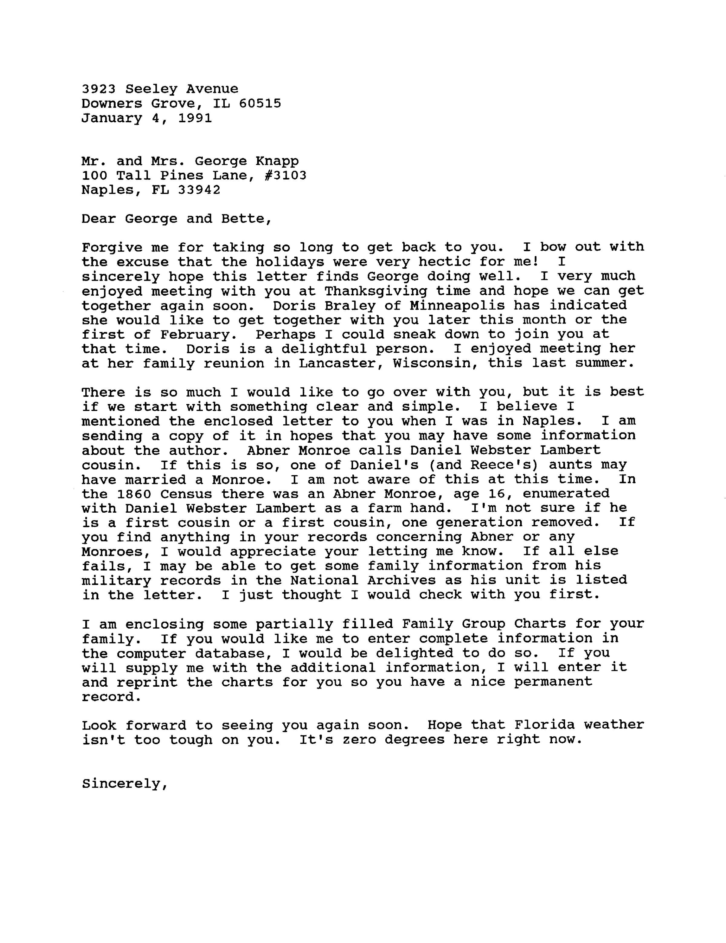 There is so much I would like to go over with you, but it is best if we start with something clear and simple. I believe I mentioned the enclosed letter to you when I was in Naples. I am sending a copy of it in hopes that you may have some information about the author. Abner Monroe calls Daniel Webster Lambert cousin. If this is so, one of Daniel's (and Reece's) aunts may have married a Monroe. I am not aware of this at this time. In the 1860 Census there was an Abner Monroe, age 16, enumerated with Daniel Webster Lambert as a farm hand. I'm not sure if he is a first cousin or a first cousin, one generation removed. If you find anything in your records concerning Abner or any Monroes, I would appreciate your letting me know. If all else fails, I may be able to get some family information from his military records in the National Archives as his unit is listed in the letter. I just thought I would check with you first.