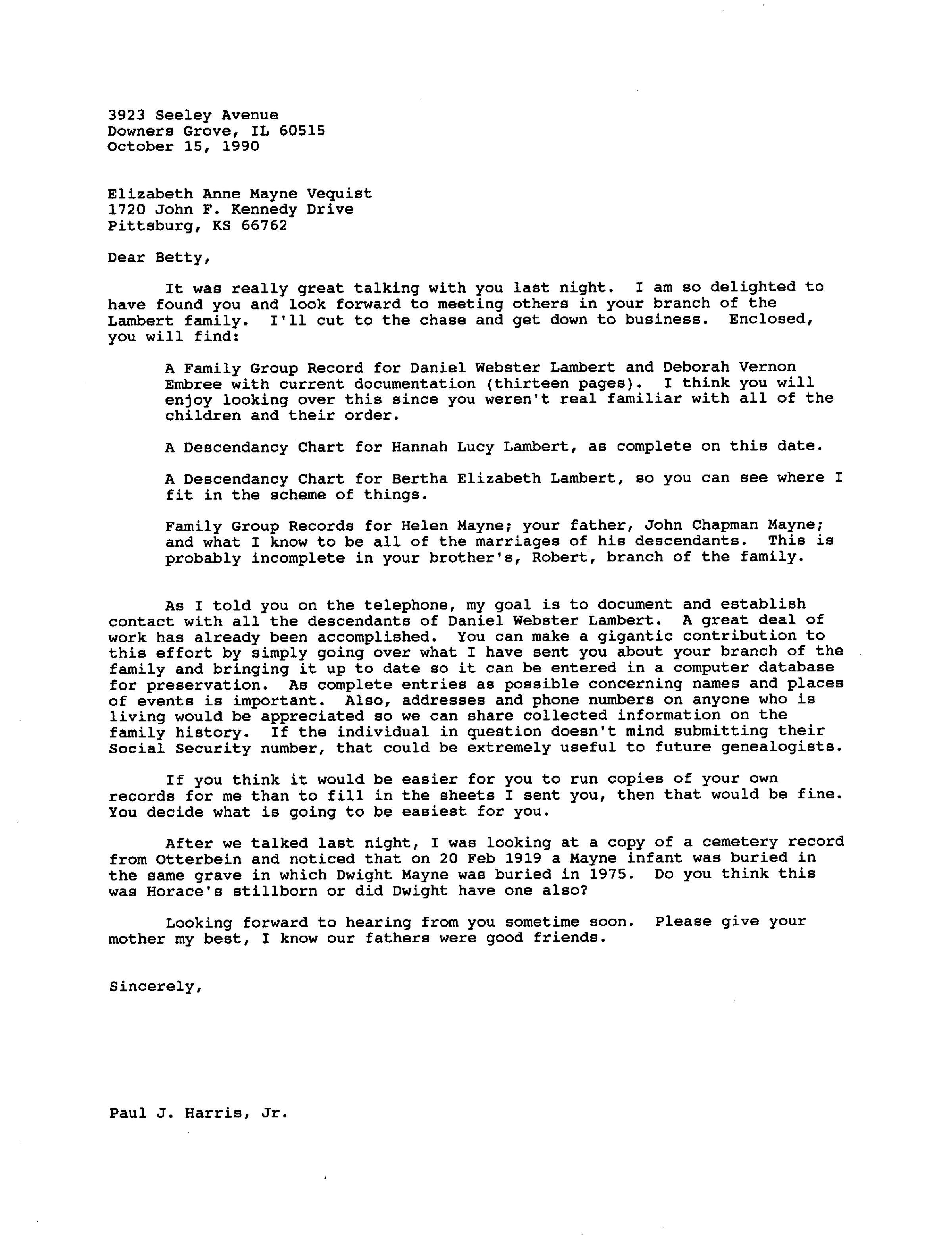 AU Harris, Paul Joseph Jr. - 1990-10-15 letter to Elizabeth Anne (Mayne) VequistEntry/Object ID