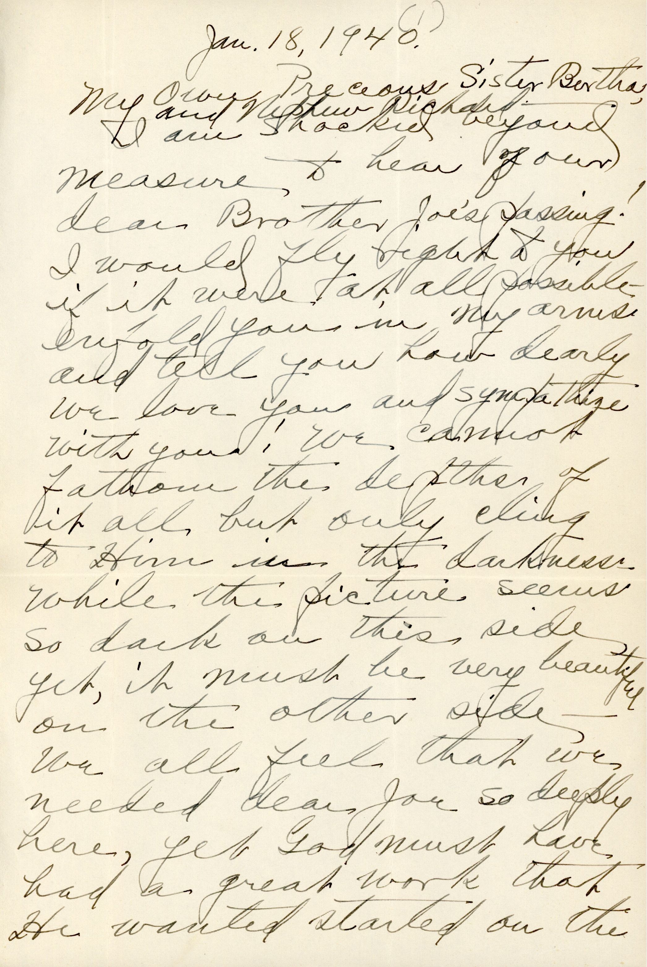 I am shocked beyond measure to hear of our dear brother Joe's passing! I would fly right to you if it were at all possible — enfold you in my arms and tell you how dearly we love you and sympathize with you! We cannot fathom the depths of it all, but only cling to Him in the darkness — while this picture seems so dark on this side, yet, it must be very beautiful on the other side — . We all feel that we needed dear Joe so deeply here, yet God must have had a great work that He wanted started [???] on the