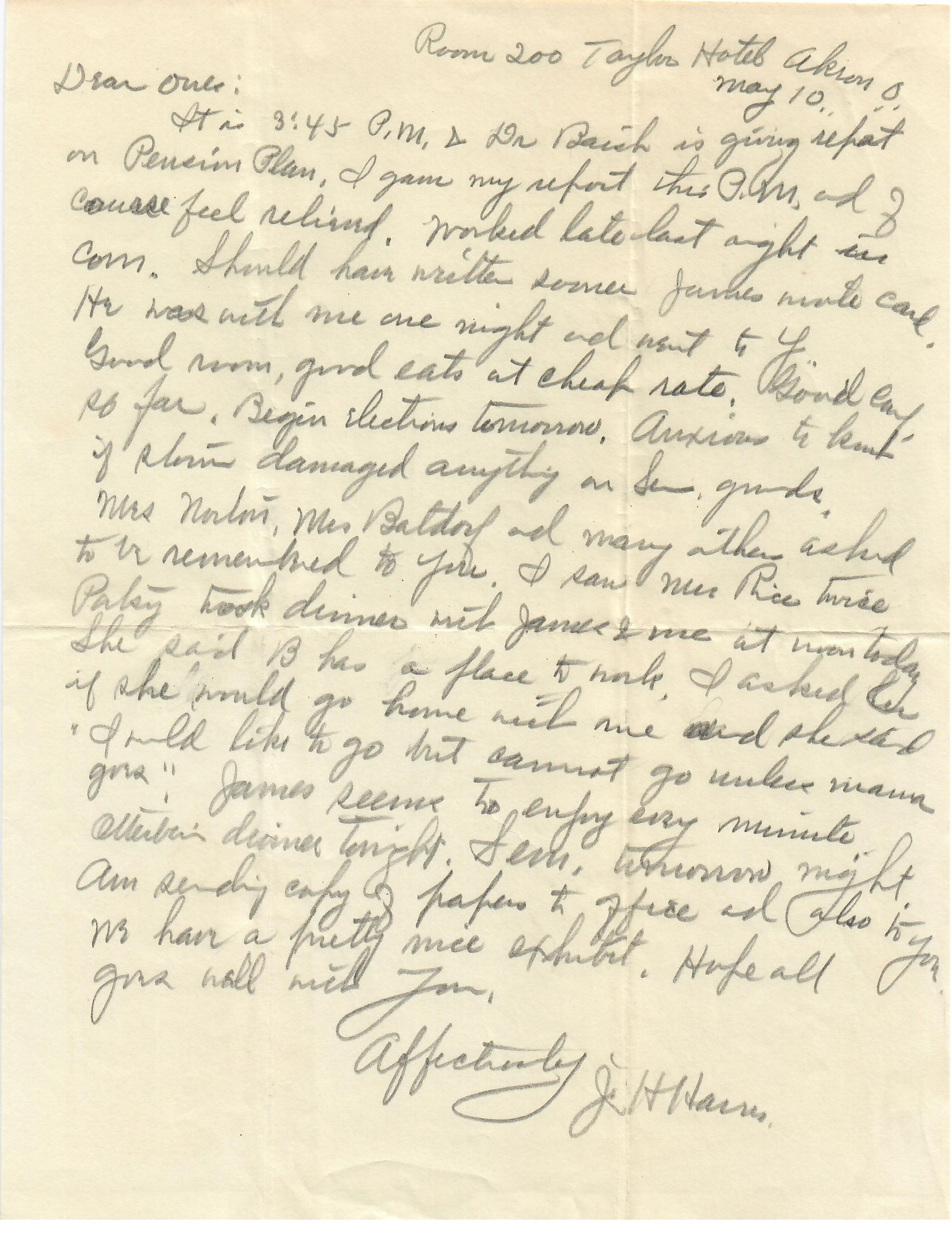 It is 3:45 P.M. & Dr Baish is giving report on Pension Plan. I gave my report this P.M. and of course feel relieved. Worked late last night in com. Should have written sooner James [write] card. He was with me one night and went to Y. Good room, good eats at cheap rate. Good conf. so far. Begin elections tomorrow. Anxious to know if storm damaged anything on [Sem. grounds.] Mrs Norton, Mrs Batdorf and many others asked to be remembered to you. I saw Mrs. Rice twice. Patsy took dinner with James and me at noon today. She said B has a place to work. I asked her if she would go home with me and she said, "I would like to go but cannot go unless mama goes." James seems to enjoy every minute. Otterbein dinner tonight. Sem. tomorrow night. Am sending copy of papers to office and also to you. We have a pretty nice exhibit. Hope all goes well with you.