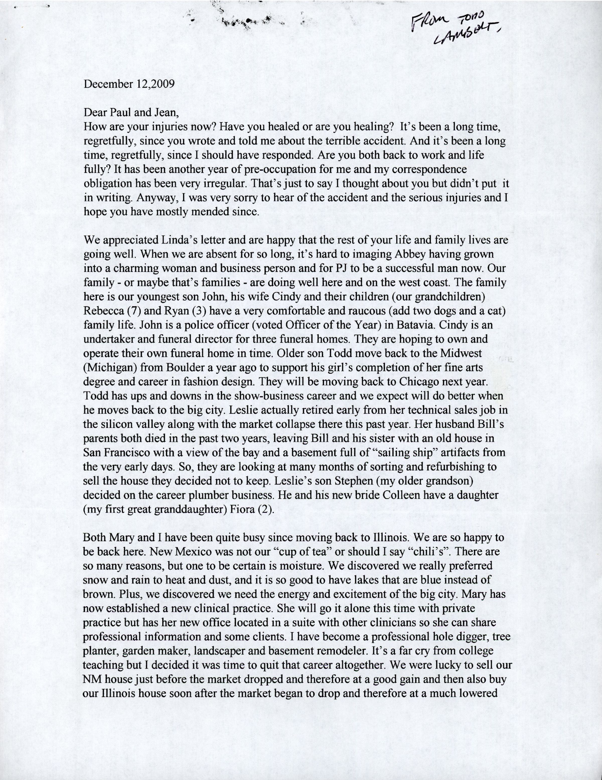How are your injuries now? Have you healed or are you healing‘? It’s been a long time, regretfully, since you wrote and told me about the terrible accident. And it’s been a long time, regretfully, since I should have responded. Are you both back to work and life fully? It has been another year of pre-occupation for me and my correspondence obligation has been very irregular. That’s just to say I thought about you but didn’t put it in writing. Anyway, I was very sorry to hear of the accident and the serious injuries and I hope you have mostly mended since.