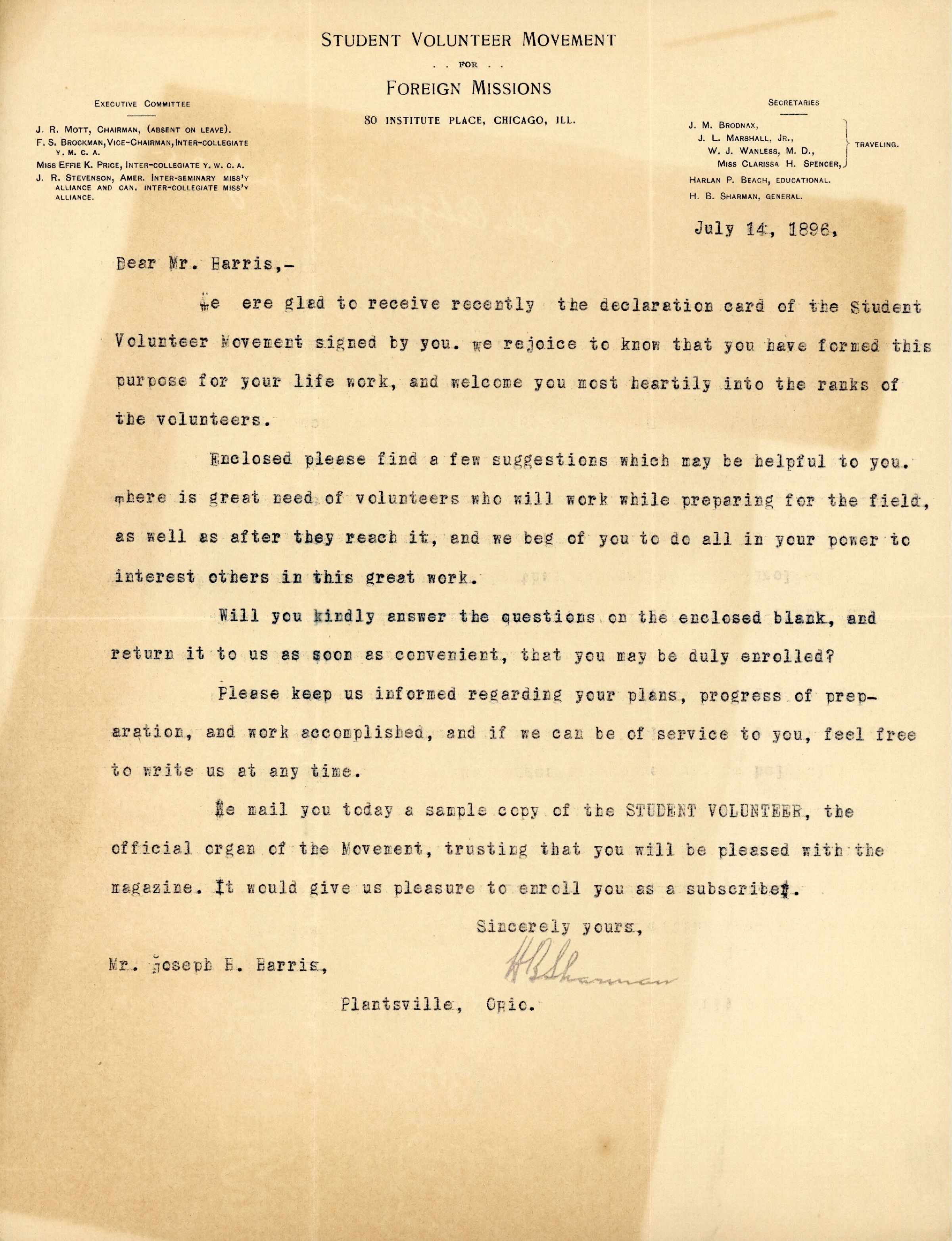 We were glad to receive recently the declaration card of the Student Volunteer Movement signed by you. We rejoice to know that you have formed this purpose for you life work, and welcome you most heartily into the ranks of the volunteers.