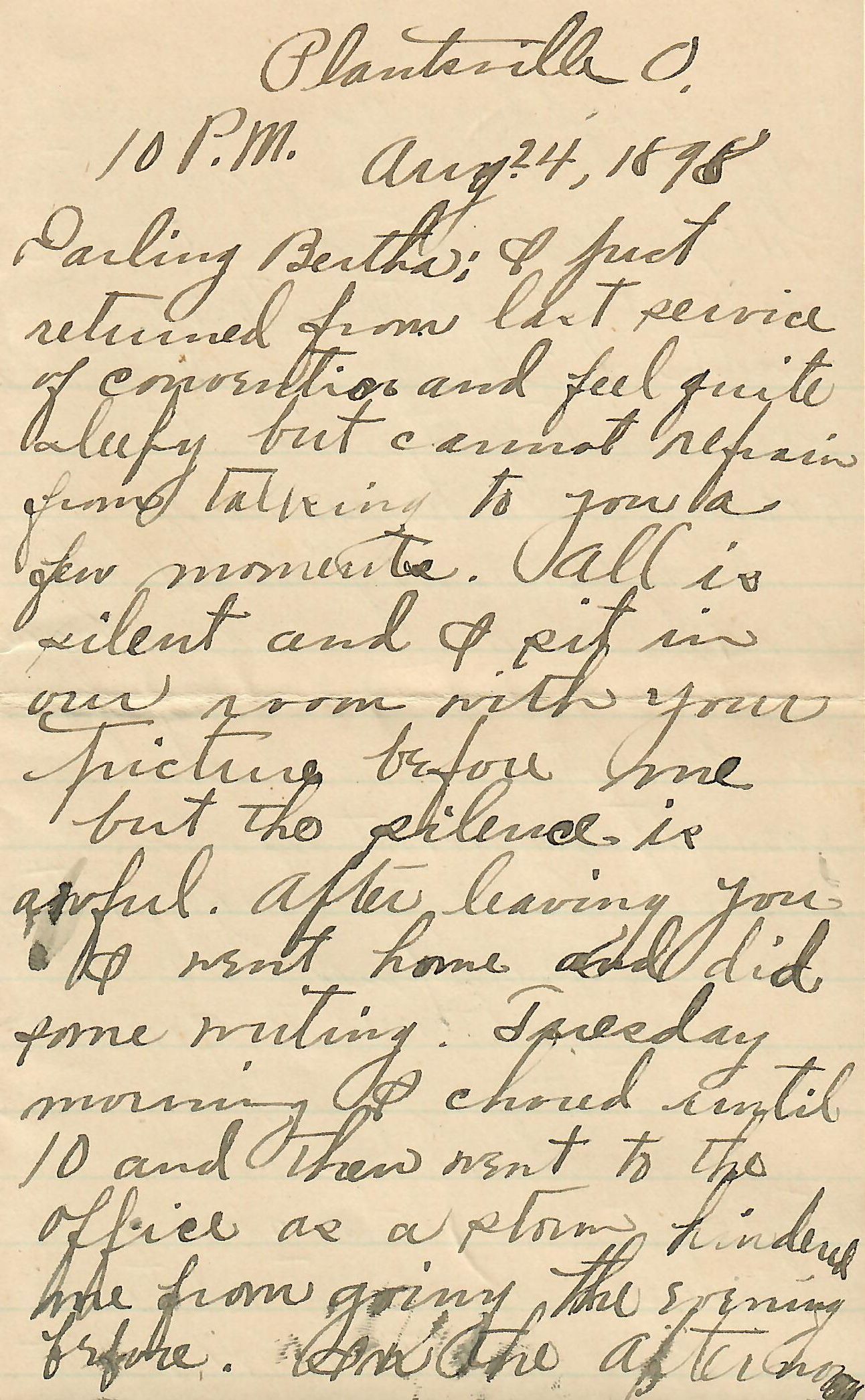 Darling Bertha: I just returned from last service of convention and feel quite sleep but cannot refrain from talking to you a few moments. All is silent and I sit in our room with your picture before me but the silence is awful. After leaving you I went home and did some writing. Tuesday morning I chored until 10 and then went to the office as a storm hindered me from going the evening before. In the afternoon your father came but Howard and I had to help Levi Rardin thresh so I left father to visit with him. We went to services together in the evening to hear Bro Geiger.