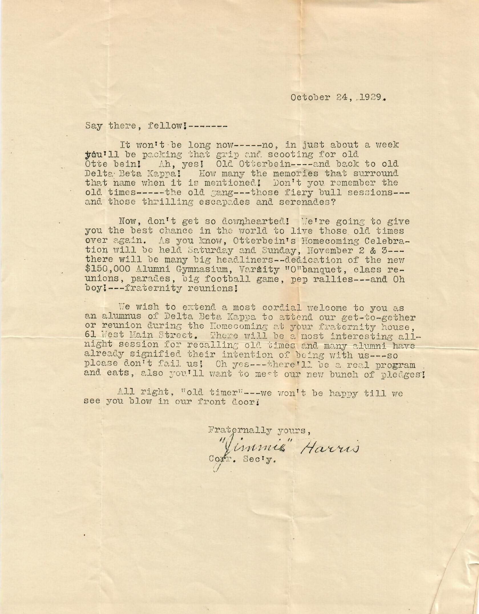 AU Harris, James Lowell - 1929-10-24 letter to Delta Beta Kappa AlumniEntry/Object ID