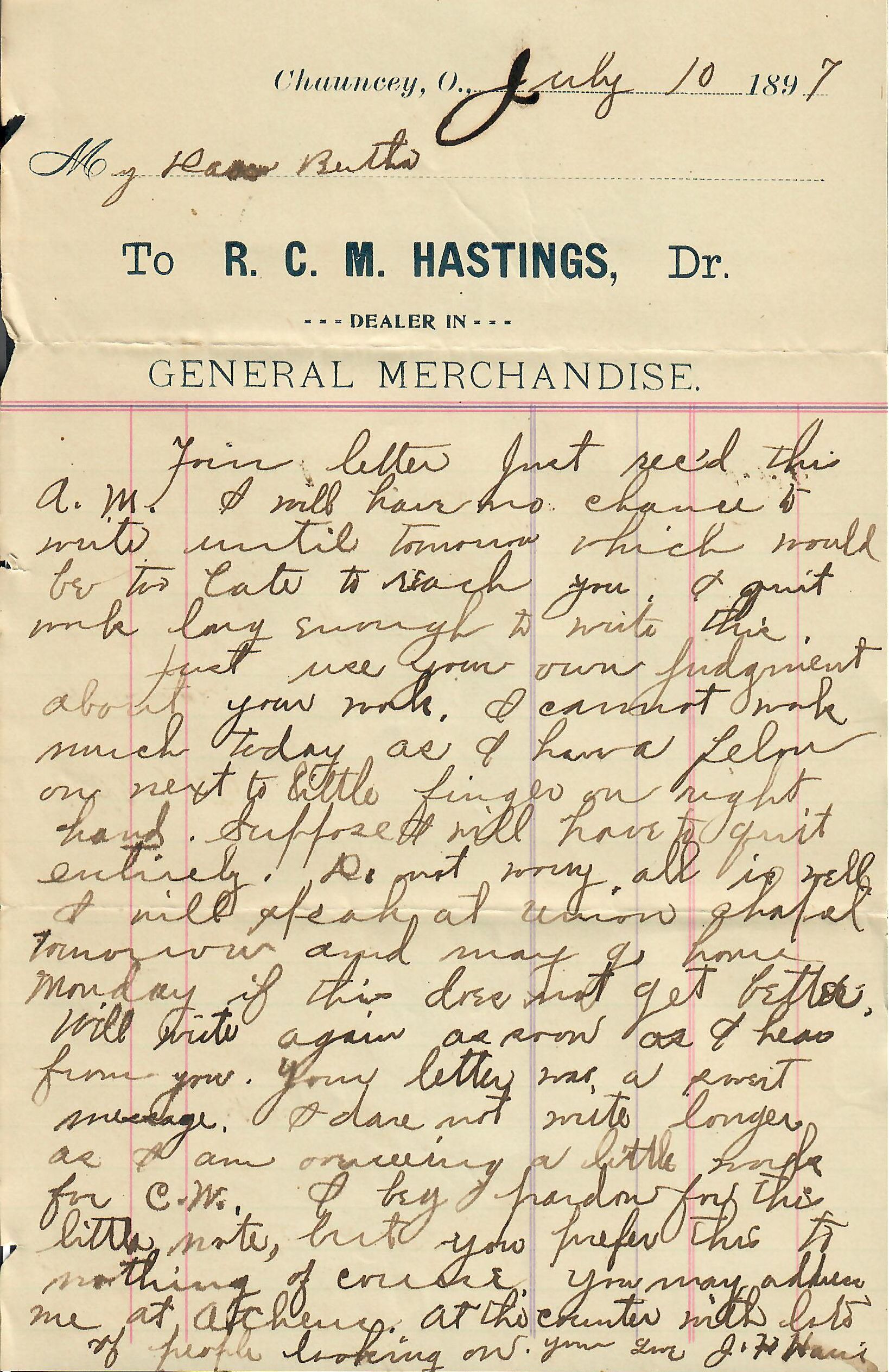 [Box 219, Athens, OH, to Miss Bertha E. Lambert, In care of Y.M.C.A. Camp, Lake Geneva, Wisconsin, written on a statement of R. C. M. Hastings, Dr., Dealer in General Merchandise, Chauncey, O.; Enclosure: Card with name Mr. William A. Hardinger]