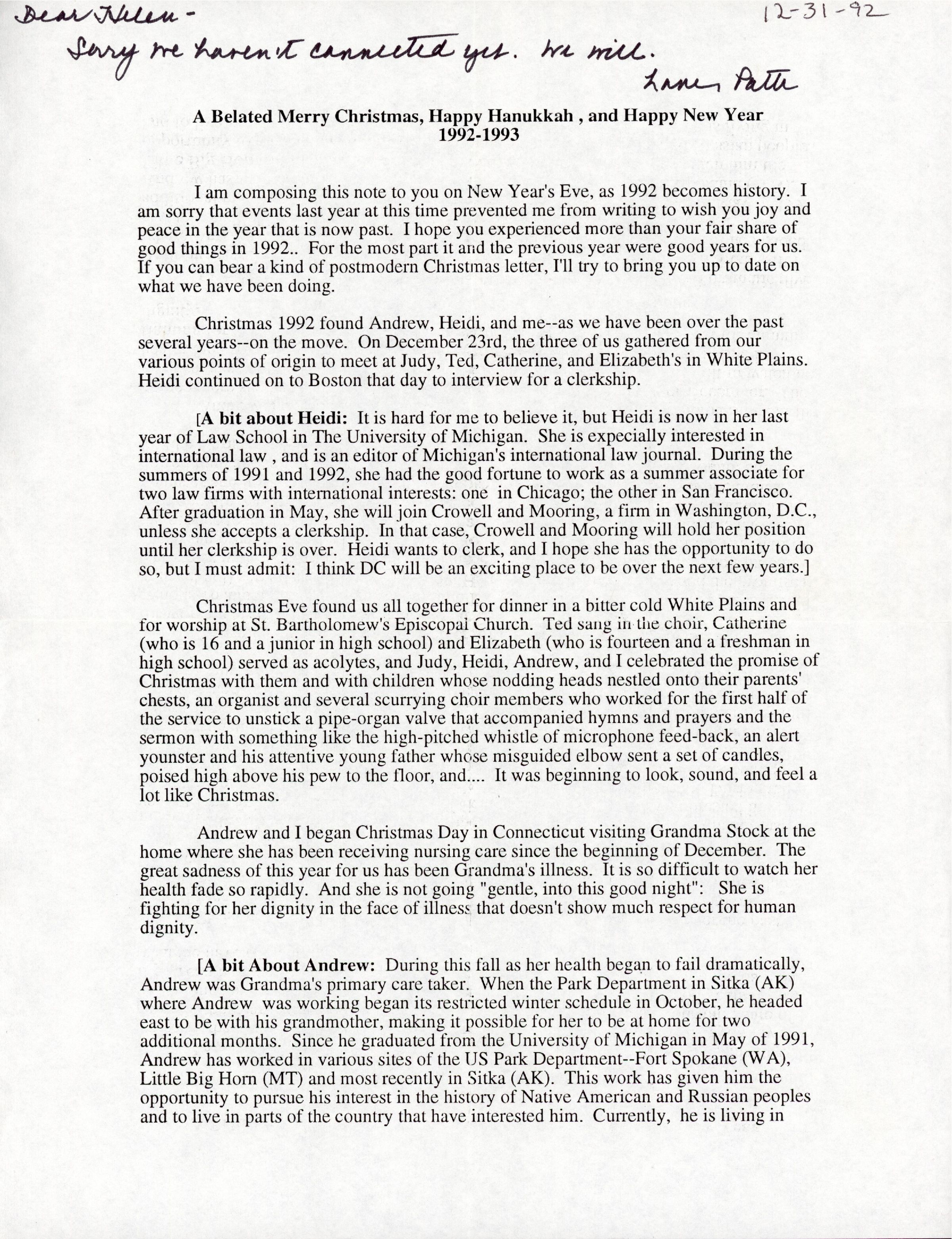 I am composing this note to you on New Year's Eve, as 1992 becomes history. I am sorry that events last year at this time prevented me from writing to wish you joy and peace in the year that is now past. I hope you experienced more than your fair share of good things in 1992.. For the most part it and the previous year were good years for us. If you can bear a kind of postmodern Christmas letter, I'll try to bring you up to date on what we have been doing.