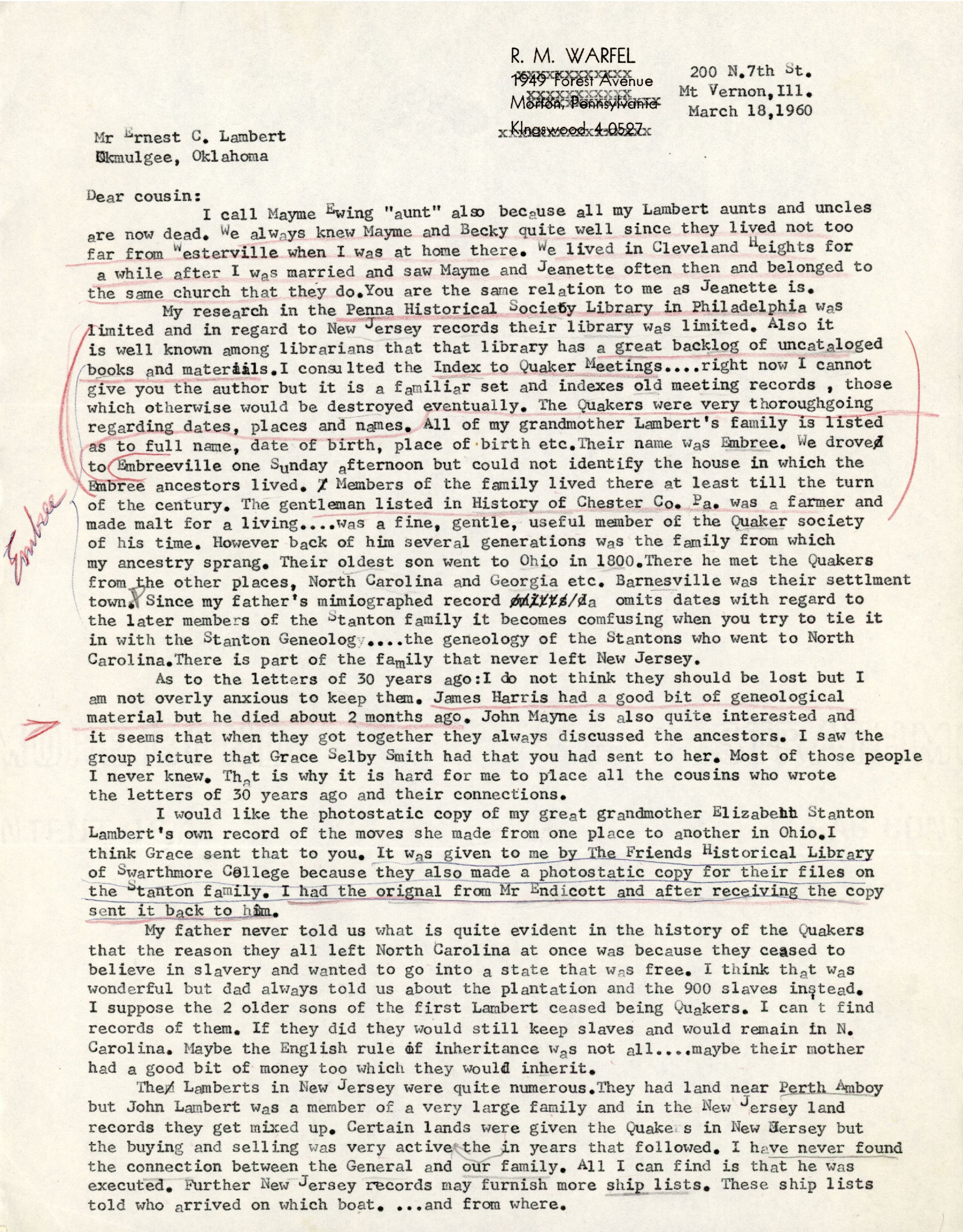 My research in the Penna Historical Society Library in Philadelphia was limited and in regard to New Jersey records their library was limited. Also it is well known among librarians that the library has a great backlog of uncatalogued books and materials. I consulted the Index to Quaker Meetings.... right now I cannot give you the author but it is a familiar set and indexes old meeting records, those which otherwise would be destroyed eventually. The Quakers were very thorough going regarding dates, places and names. All of my grandmother Lambert's family is listed as to full name, date of birth, place of birth etc. Their name was Embree. We drove to Embreeville one Sunday afternoon but could not identify the house in which the Embree ancestors lived. Members of the family lived there at least till the turn of the century. The gentleman listed in History of Chester Co. Pa. was a farmer and made malt for a living.... was a fine, gentle, useful member of the Quaker society of his time. However back of him several generations was the family from which my ancestry sprang. Their oldest son went to Ohio in 1800. There he met the Quakers from the other places, North Carolina and Georgia etc. Barnesville was their settlement town. Since my father's mimeographed record omits dates with regard to the later members of the Stanton family it becomes confusing when you try to tie it in with the Stanton Genealogy....the genealogy of the Stantons who went to North Carolina. There is part of the family that never left New Jersey.