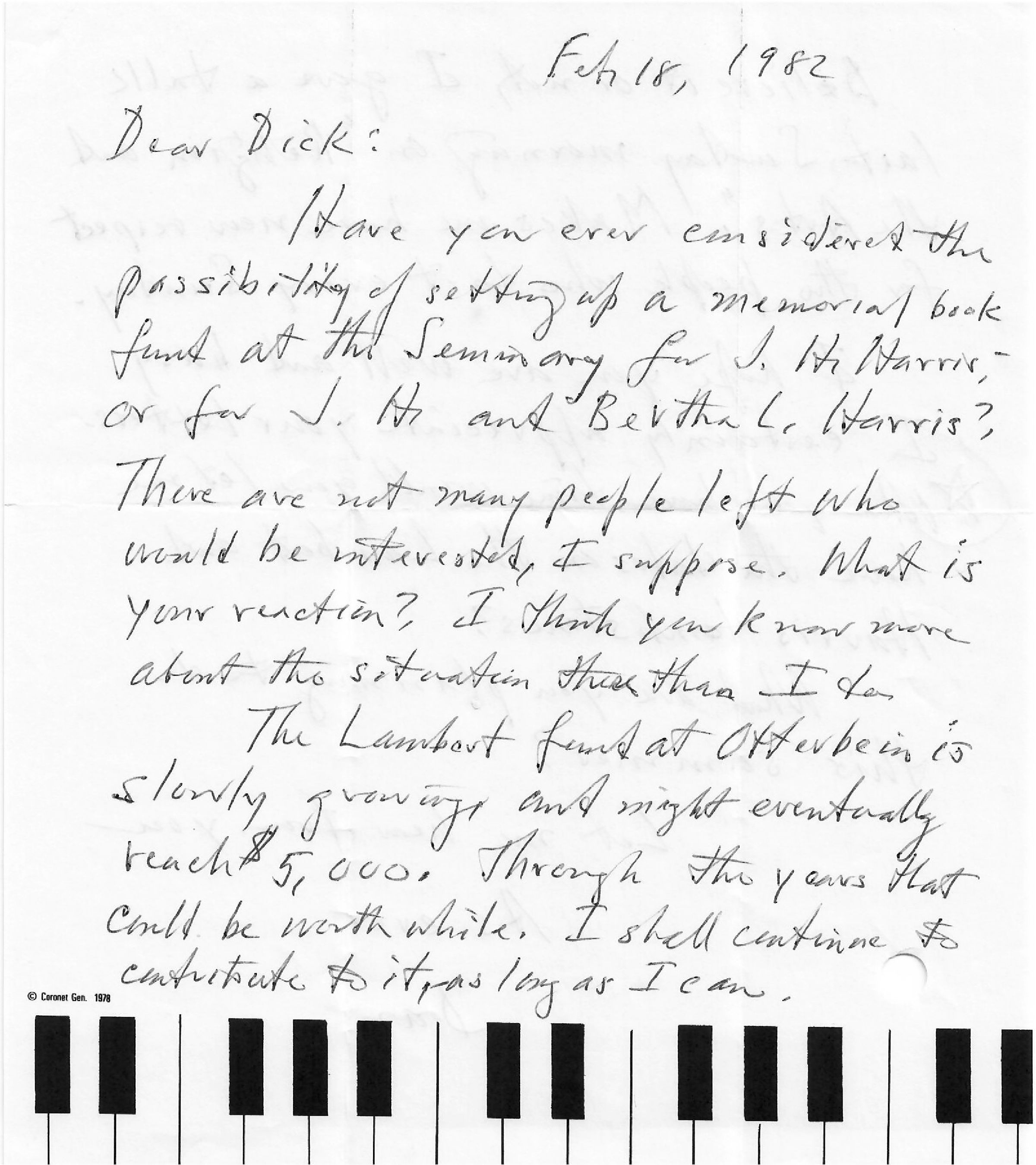 Have you ever considered the possibility of setting up a memorial book fund at the seminary for J. H. Harris, or for J. H. and Bertha L. Harris? There are not many people left who would be interested, I suppose. What is your reaction? I think you know more about the situation there than I do.