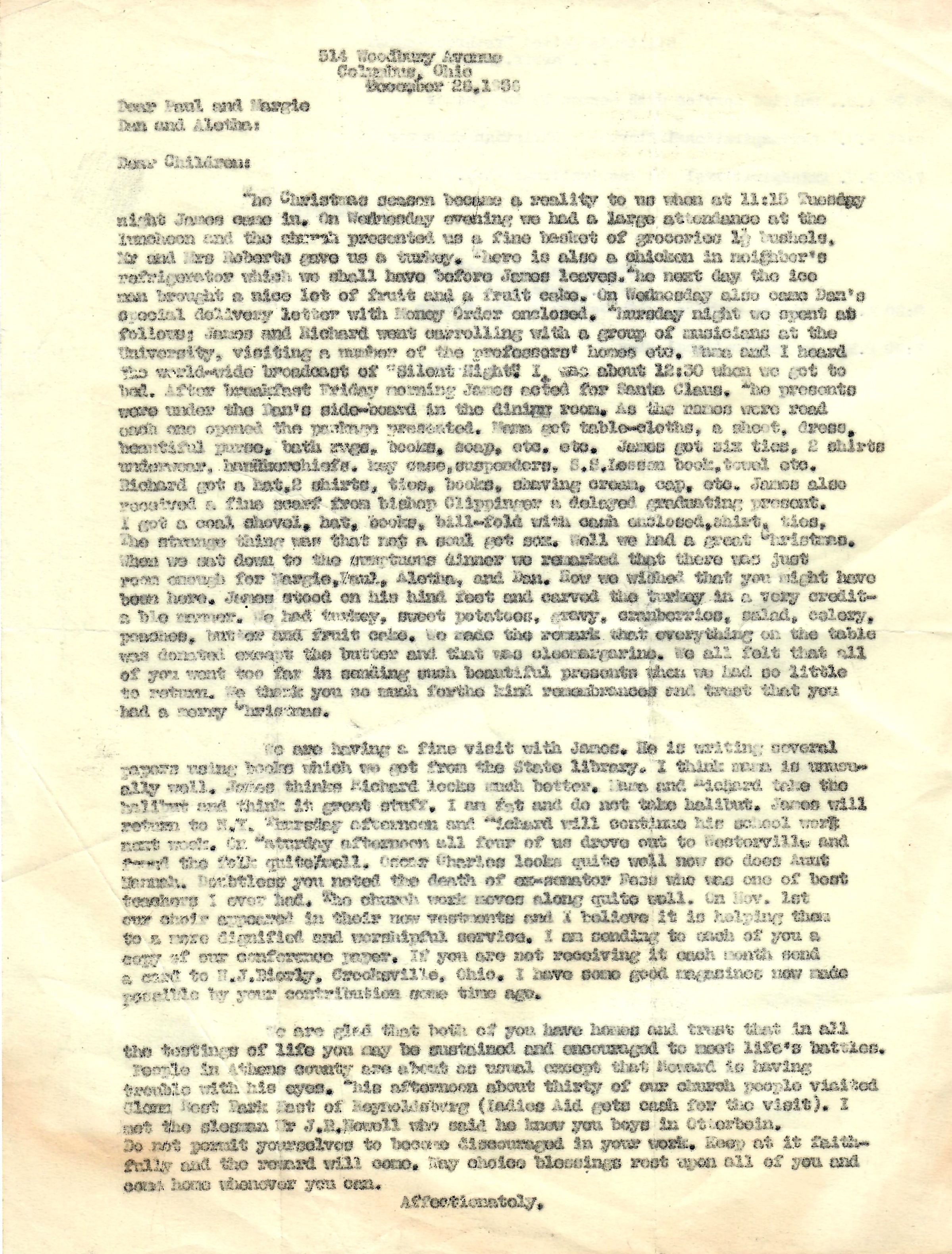 The Christmas season became a reality to us when at 11:15 Tuesday night James came in. On Wednesday evening we had a large attendance at the luncheon and the church presented us a fine basket of groceries 1 1/2 bushels. Mr. and Mrs. Roberts gave us a turkey. There is also a chicken in neighbor's refrigerator which we shall have before James leaves. The next day the ice man brought a nice lot of fruit and a fruit cake. On Wednesday also came Dan's special delivery letter with Money Order enclosed. Thursday night we spent as follows: James and Richard went carrolling with a group of musicians at the University, visiting a number of the professors' homes etc. Mama and I heard the world-wide broadcast of "Silent Night." It was about 12:30 when we got to bed. After breakfast Friday morning James acted for Santa Claus. The presents were under the Dan's side-board in the dining room. As the names were read each one opened the package presented. Mama got table-cloths, a sheet, dress, beautiful purse, bath rugs, books, soap, etc. etc. James got six ties, 2 shirts, underwear, handkerchiefs, key case, suspenders, S.S. Lesson book, towel etc. Richard got a hat, 2 shirts, ties, books, shaving cream, cap, etc. James also received a fine scarf from bishop Clippinger, a delayed graduating present. I got a coal shovel, hat, books, bill-fold with cash enclosed, shirt, ties. The strange thing was that not a soul got sox. Well we had a great Christmas. When we sat down to the sumptuous dinner we remarked that there was just room enough for Margie, Paul, Aletha, and Dan. How we wished that you might have been here. James stood on his hind feet and carved the turkey in a very creditable manner. We had turkey, sweet potatoes, gravy, cranberries, salad, celery, peaches, butter and fruit cake. We made the remark that everything on the table was donated except the butter and that was oleomargarine. We all felt that all of you went too far in sending such beautiful presents when we had so little to return. We thank you as much for the kind remembrances and trust that you had a merry Christmas.