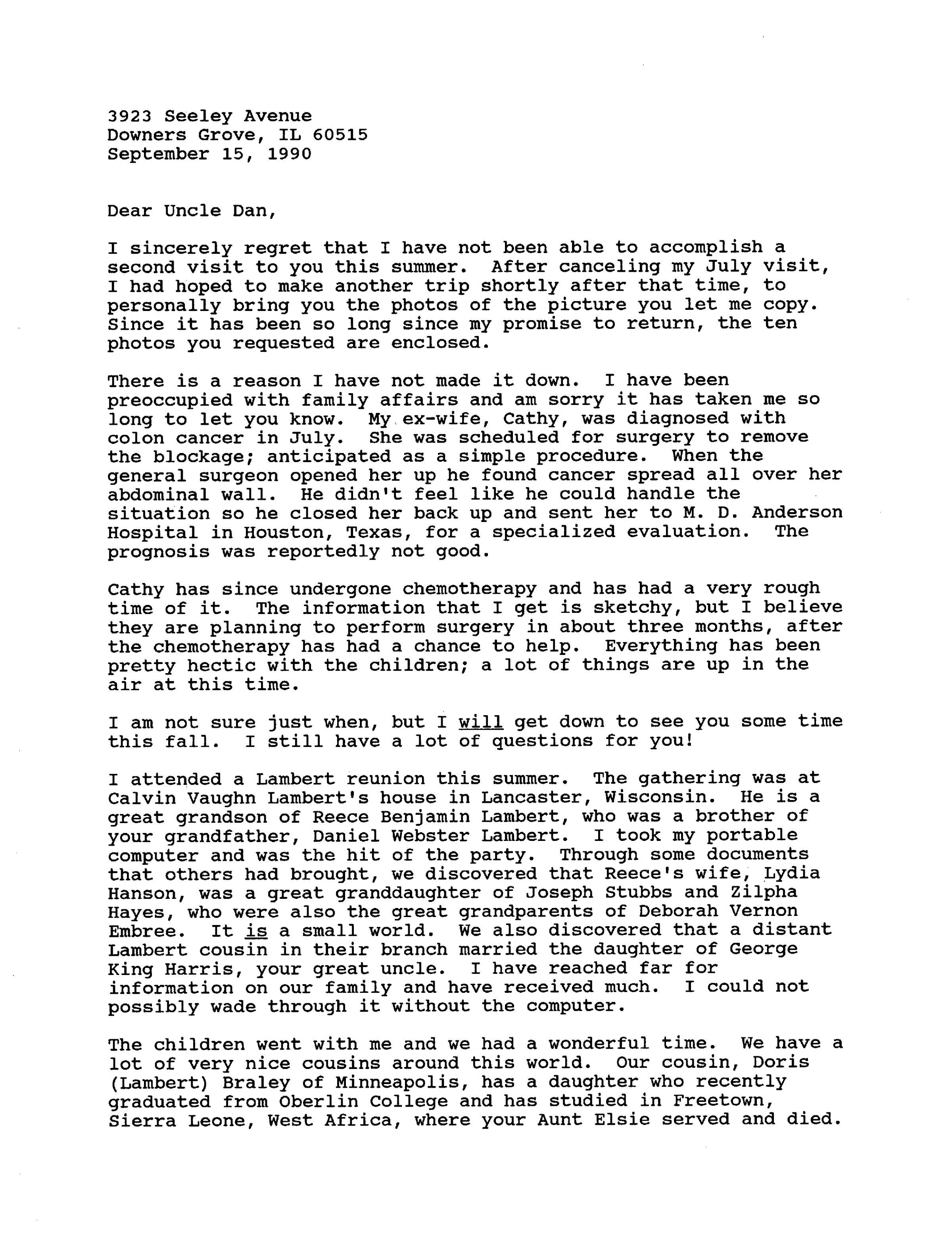 I attended a Lambert reunion this summer. The gathering was at Calvin Vaughn Lambert's house in Lancaster, Wisconsin. He is a great grandson of Reece Benjamin Lambert, who was a brother of your grandfather, Daniel Webster Lambert. I took my portable computer and was the hit of the party. Through some documents that others had brought, we discovered that Reece's wife, Lydia Hanson, was a great granddaughter of Joseph Stubbs and Zilpha Hayes, who were also the great grandparents of Deborah Vernon Embree. It is a small world. We also discovered that a distant Lambert cousin in their branch married the daughter of George King Harris, your great uncle. I have reached far for information on our family and have received much. I could not possibly wade through it without the computer.