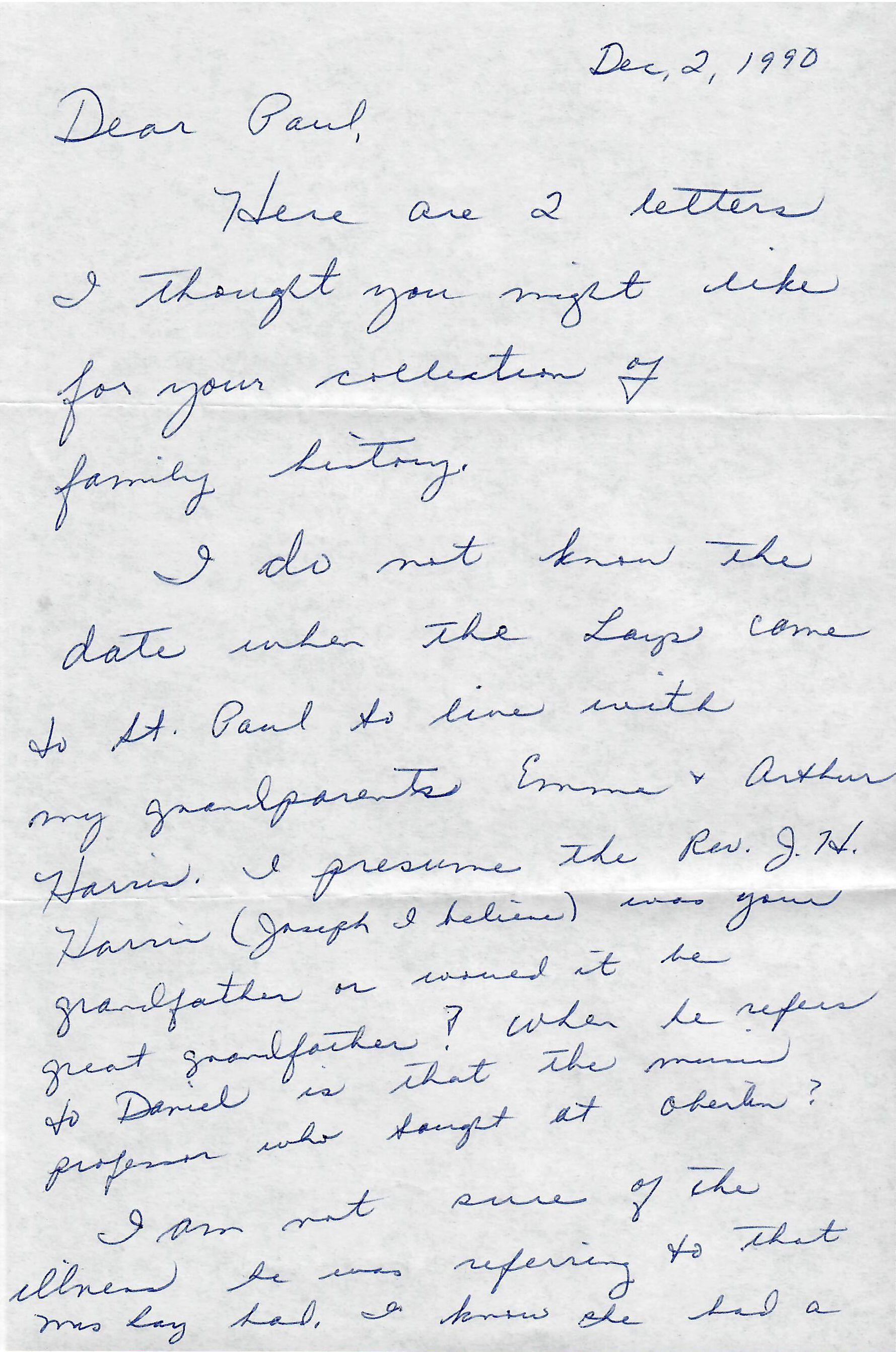 I do not know the date when the Lays came to St. Paul to live with my grandparents Emma & Arthur Harris. I presume the Rev. J. H. Harris (Joseph I believe) was your grandfather or would it be great grandfather? When he refers to Daniel is that the music professor who taught at Oberlin?