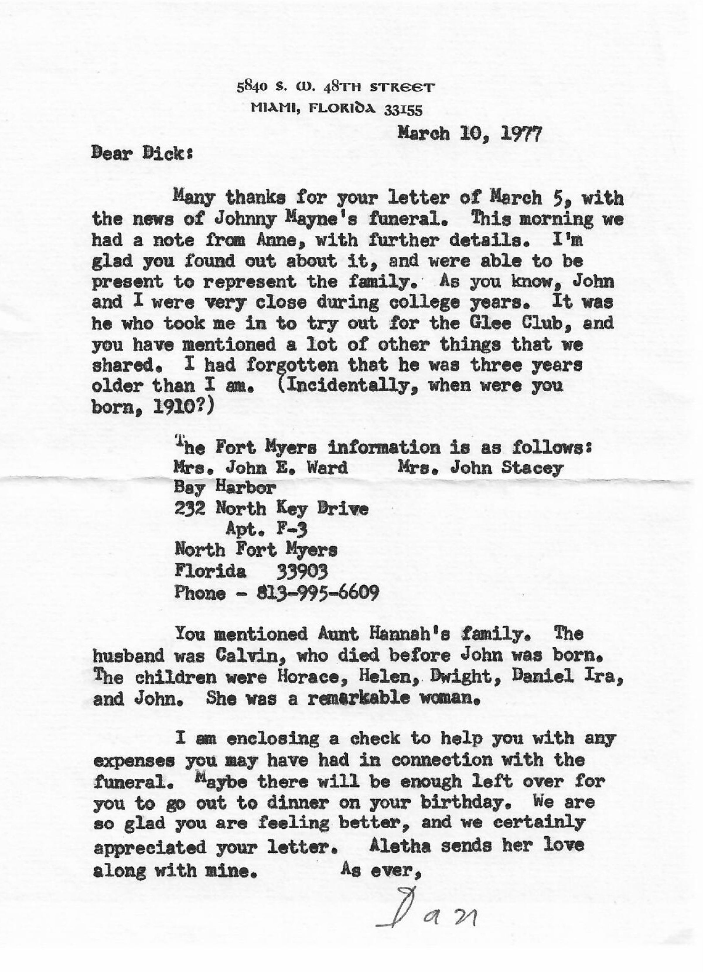 Many thanks for your letter of March 5, with the news of Johnny Mayne's funeral. This morning we had a note from Anne, with further details. I'm glad you found out about it, and were able to be present to represent the family. As you know, John and I were very close during college years. It was he who took me in to try out for the Glee Club, and you have mentioned a lot of other things that we shared. I had forgotten that he was three years older than I am. (Incidentally, when were you born, 1910?)
