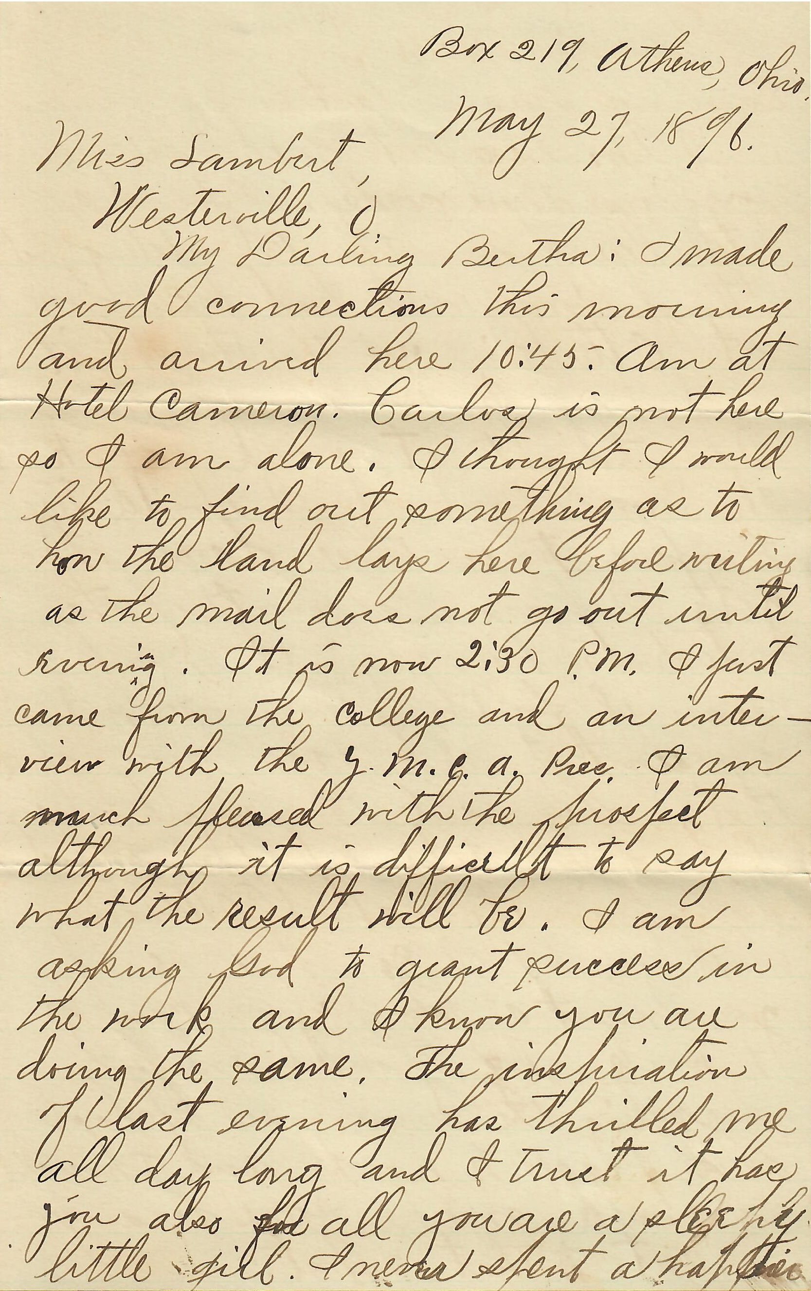 [Athens, OH, to Miss Bertha E. Lambert, Westerville, Ohio, “Franklin Co.”]