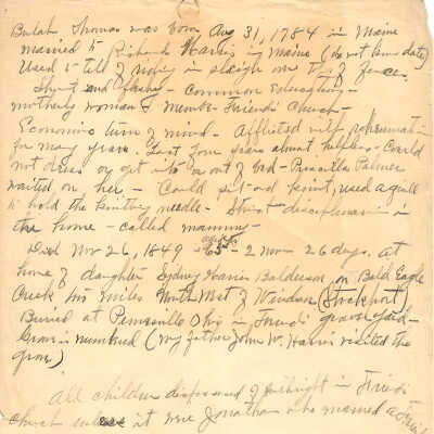 Beulah Thomas was born in Maine, August 31, 1784 and was married to Richard Harris October 23, 1804. She used to tell of riding in a sleigh over the top of fences because the snow was so deep. Early in their married life they moved to Mt. Pleasant, Jefferson County, Ohio, where their eleven children were born. They then moved to Pennsville, Morgan County, Ohio. She was a member of the Friends' Church and all the children possessed a birthright in the church, but on account of marrying outside of the church, all the children who grew to maturity were dispossessed of their birthright, unless it were Jonathan who married in the church. She was industrious and of economic turn of mind. In stature, she was short and fleshy. She received a common education and was a strict disciplinarian. They called her "mammy". She was afflicted with rheumatism and during the last four years of her life was almost helpless. She could not dress or undress alone nor get into or out of bed without help. Priscilla Palmer, a granddaughter waited on her. She could sit and knit and use a quill to hold the knitting needle. She died November 26, 1849, aged 65 years, 2 months and 25 days at he home of her daughter, Mrs. Sydney Harris Balderson, on Bald Eagle Creek, 2 miles northwest of Windsor (Stockport) Ohio and was buried in the Friends Cemetery at Pennsville, Morgan County, Ohio. The grave is numbered.