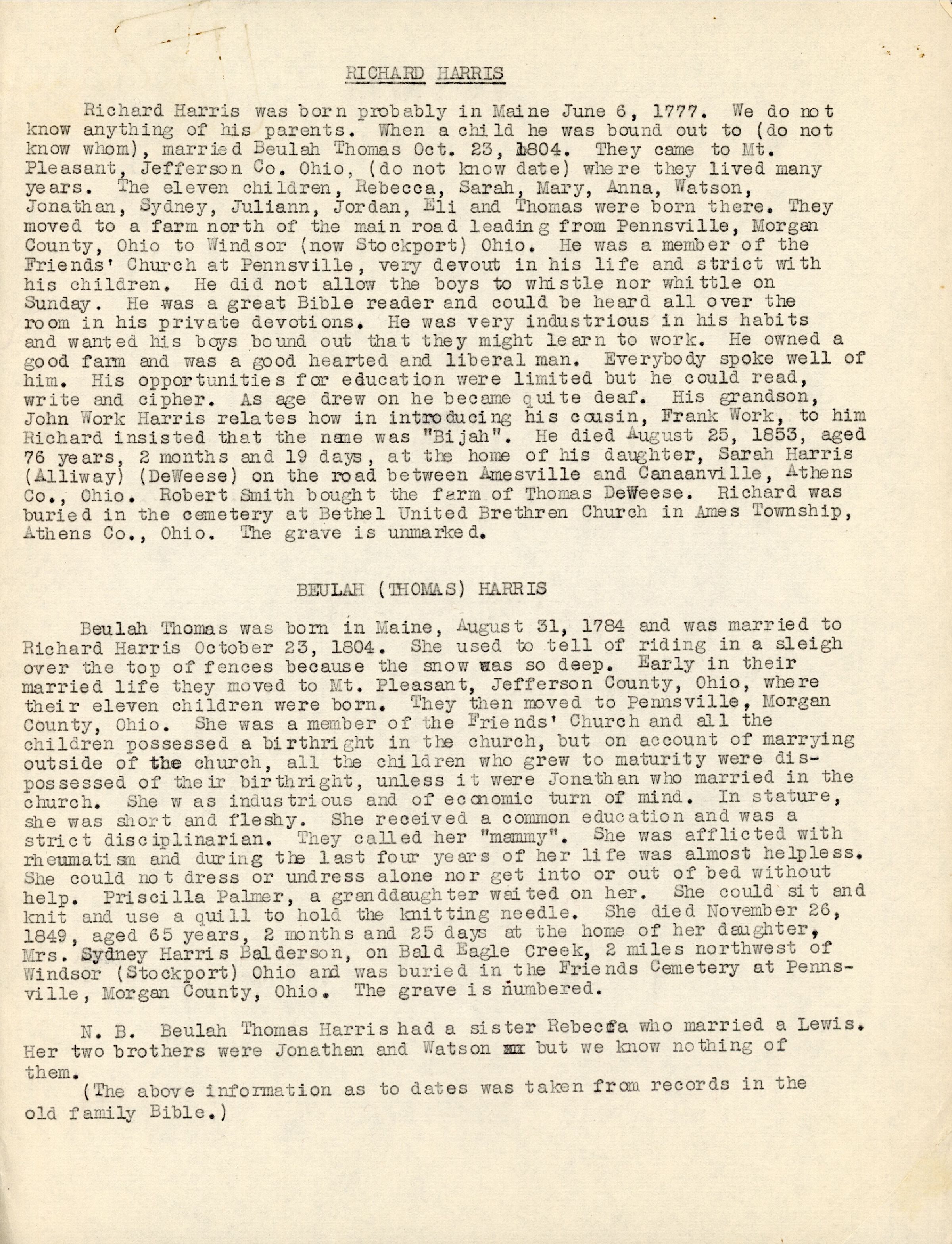 Richard Harris was born probably in Maine June 6, 1777. We do not know anything of his parents. When a child he was bound out to (do not know whom), married Beulah Thomas October 23, 1804. They came to Mt. Pleasant, Jefferson County, Ohio, (do not know date) where they lived many years. The eleven children, Rebecca, Sarah, Mary, Anna, Watson, Jonathan, Sydney, Juliann, Jordan, Eli, and Thomas were born there. They moved to a farm north of the main road leading from Pennsville, Morgan County, Ohio to Windsor (now Stockport), Ohio. He was a member of the Friends' Church at Pennsville, very devout in his life and strict with his children. He did not allow the boys to whistle nor whittle on Sunday. He was a great Bible reader and could be heard all over the room in his private devotions. He was very industrious in his habits and wanted his boys bound out that they might learn to work. He owned a good farm and was a good hearted liberal man. Everybody spoke well of him. His opportunities for education were limited, but he could read, write, and cipher. As age drew on he became quite deaf. His grandson, John Work Harris, relates how in introducing his cousin, Frank Work, to him Richard insisted that the name was "Bijah." He died August 25 1853, aged 76 years, 2 months, 19 days, at the home of his daughter, Sarah Harris (Alliway) (DeWeese) on the road between Amesville and Canaanville, Athens County, Ohio. Robert Smith bought the farm of Thomas DeWeese. Richard was buried in the cemetery at Bethel United Brethren Church in Ames Township, Athens County, Ohio. The grave is unmarked.