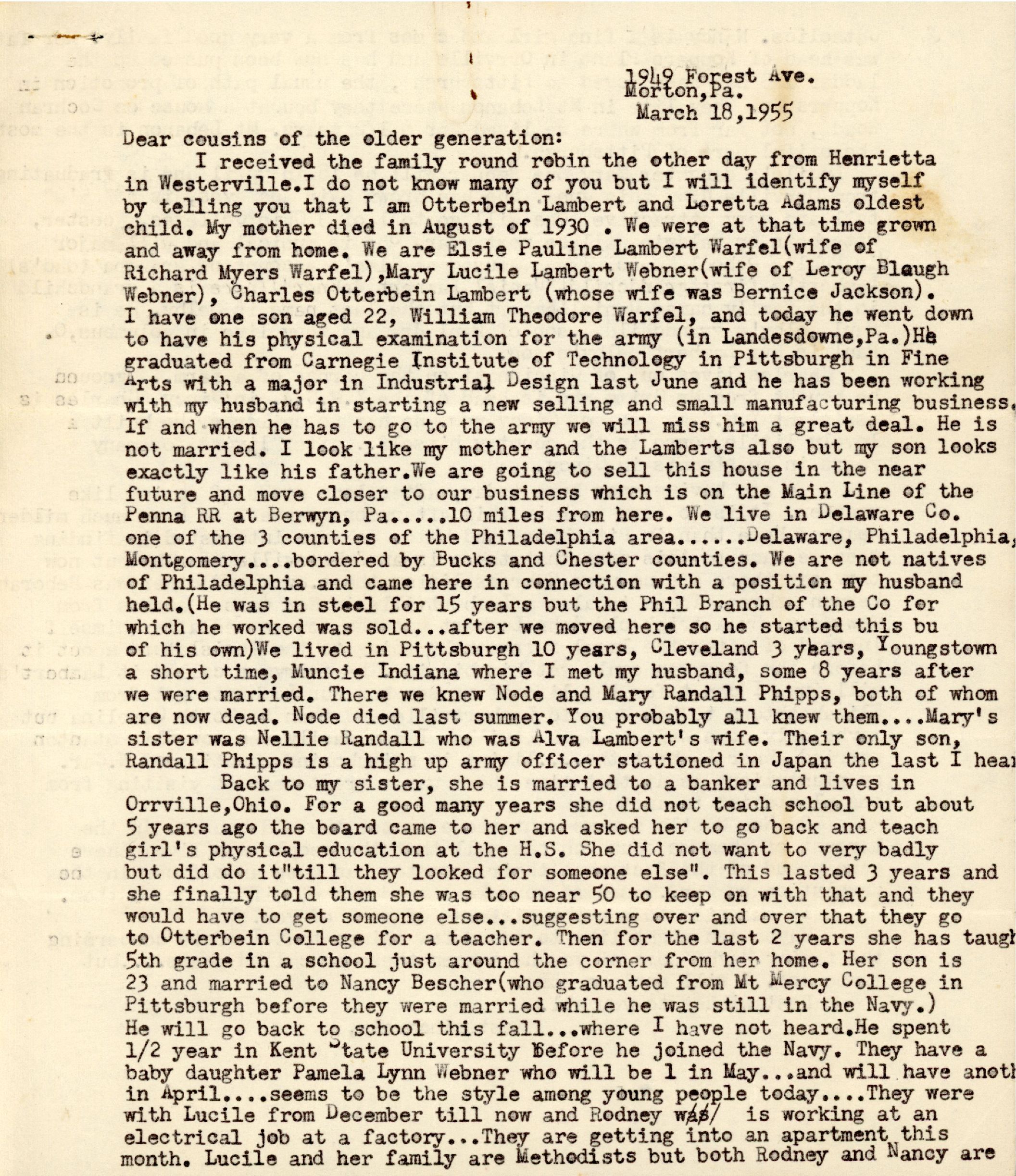 I received the family round robin the other day from Henrietta in Westerville. I do not know many of you but I will identify myself by telling you that I am Otterbein Lambert and Loretta Adams oldest child. My mother died in August of 1930. We were at that time grown and away from home. We are Elsie Pauline Lambert Webner (wife of Richard Myers Warfel), Mary Lucile Lambert Webner (wife of Leroy Blough Webner), Charles Otterbein Lambert (whose wife was Bernice Jackson). I have one son aged 22, William Theodore Warfel, and today he went down to have his physical examination for the army (in Landesdowne, Pa.). He graduated from Carnegie Institute of Technology in Pittsburgh in Fine Arts with a major in Industrial Design last June and he has been working with my husband in starting a new selling and small manufacturing business. If and when he has to go to the army we will miss him a great deal. He is not married. I look like my mother and the Lamberts also but my son looks exactly like his father. We are going to sell this house in the near future and move closer to our business which is on the Main Line of the Penna RR at Berwyn, Pa..... 10 miles from here. We live in Delaware Co. one of the 3 counties of the Philadelphia...... Delaware, Philadelphia, Montgomery.... bordered by Bucks and Chester counties. We are not natives of Philadelphia and came here in connection with a position my husband held. (He was in steel for 15 years but the Phil Branch of the Co for which he worked was sold... after we moved here so he started this bu of his own) We lived in Pittsburgh 10 years, Cleveland 3 years, Youngstown a short time, Muncie Indiana where I met my husband, some 8 years after we were married. There we knew Node and Mary Randall Phipps, both of whom are now dead. Node died last summer. You probably all knew them.... Mary's sister was Nellie Randall who was Alva Lambert's wife. Their only son, Randal Phipps is a high up army officer stationed in Japan the last I heard.