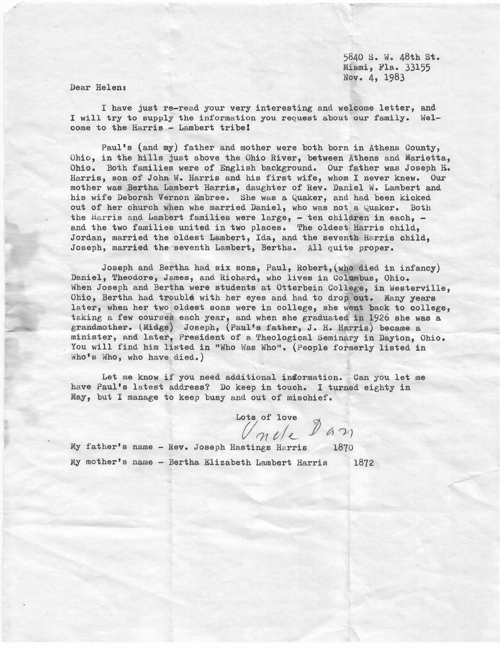 I have just re-read your very interesting and welcome letter, and I will try to supply the information you request about your family. Welcome to the Harris - Lambert tribe!
