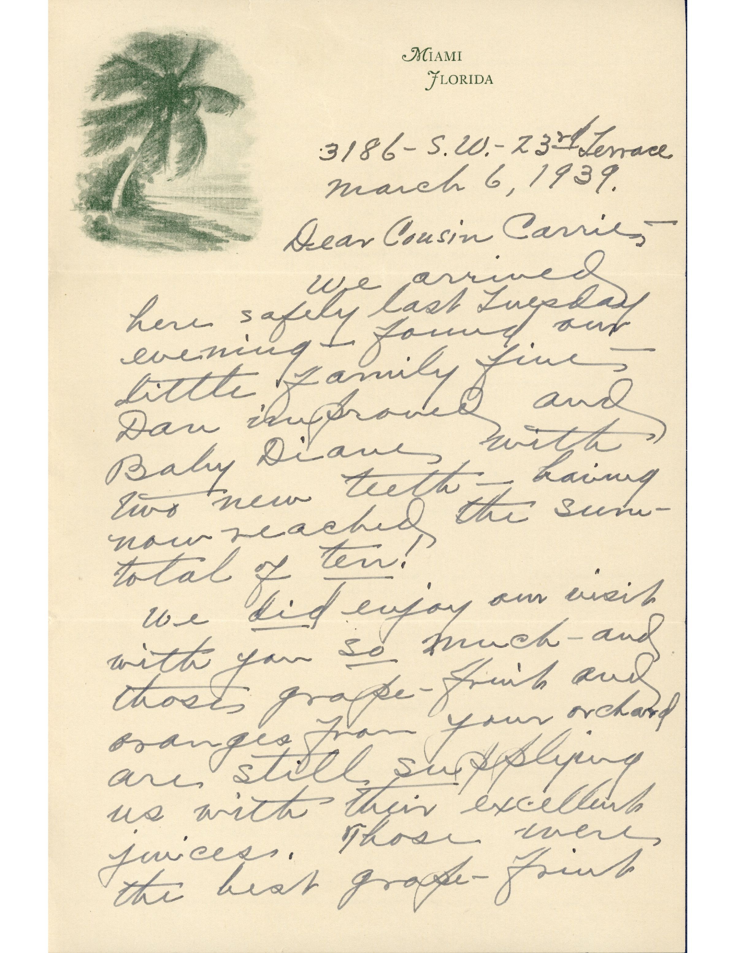 We arrived here safely last Tuesday evening — found our little family fine. Dan improved and Baby Diane with two new teeth — having now reached the sum-total of ten!