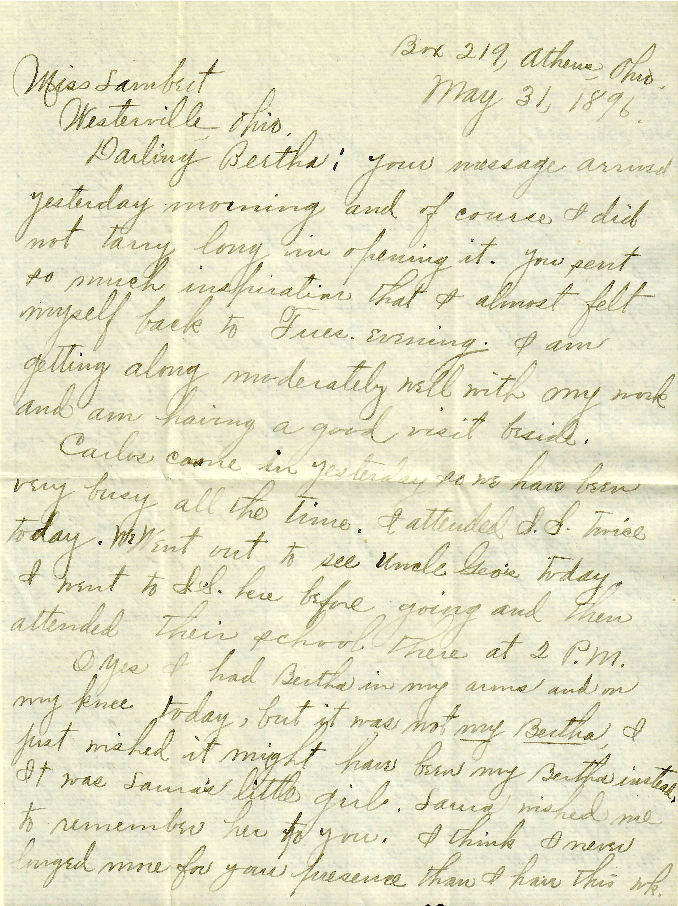 [Athens, OH, to Miss Bertha E. Lambert, Westerville, Ohio, “Franklin Co.”]