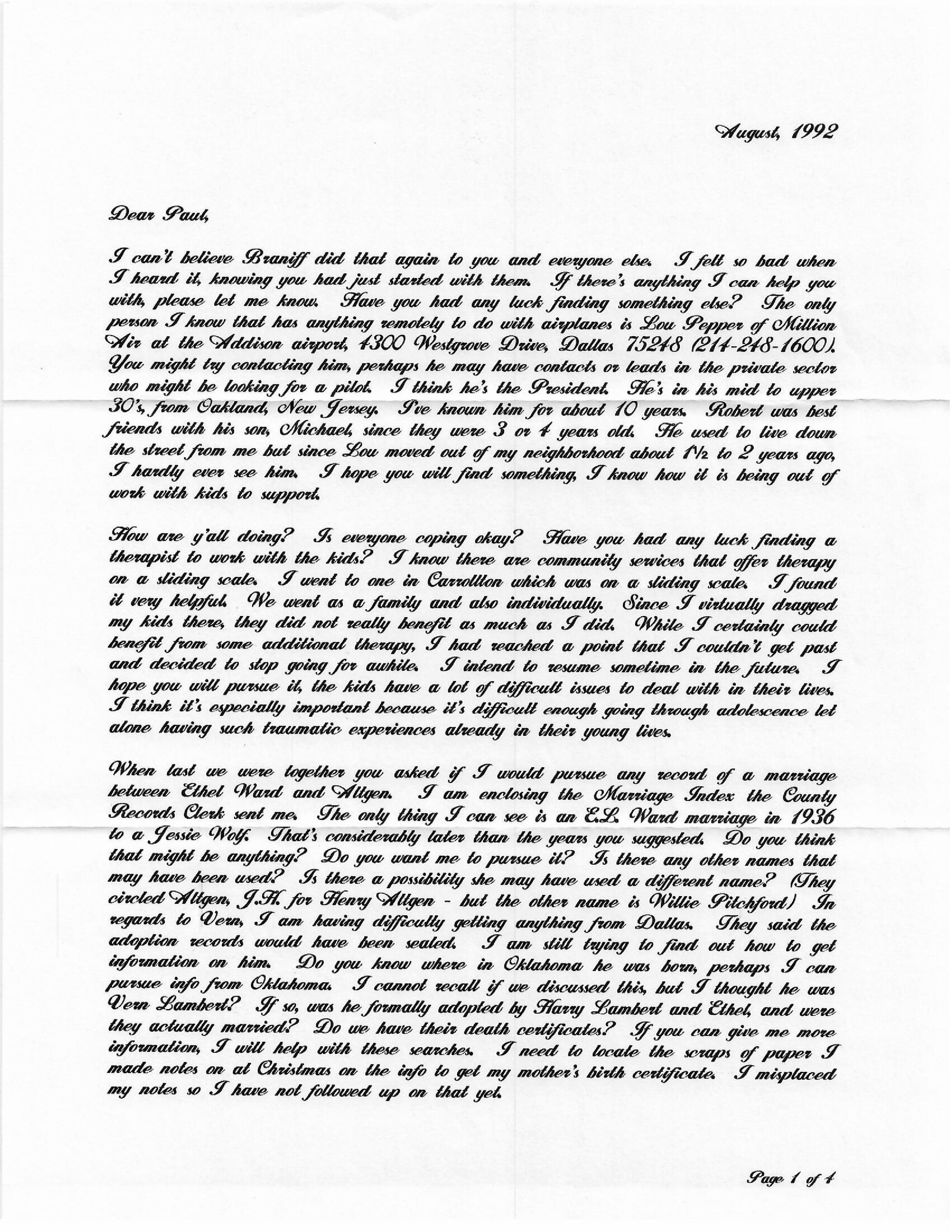 I can't believe Braniff did that again to you and everyone else. I felt so bad when I heard it, knowing you had just started with them. If there's anything I can help you with, please let me know. Have you had any luck finding something else? The only person I know that has anything remotely to do with airplanes is Lou Pepper of Million Air at the Addison airport, 1300 Westgrove Drive, Dallas 75248 (214-248-1600). You might try contacting him, perhaps he may have contacts or leads in the private sector who might be looking for a pilot. I think he's the President. He's in his mid to upper 30s, from Oakland, New Jersey. I've known him for about 10 years. Robert was best friends with his son, Michael, since they were 3 of 4 years old. He used to live down the street from me but since Lou moved out of my neighborhood about 1 1/2 to 2 years ago, I hardly ever see him. I hope you will find something, I know how it is being out of work with kids to support.