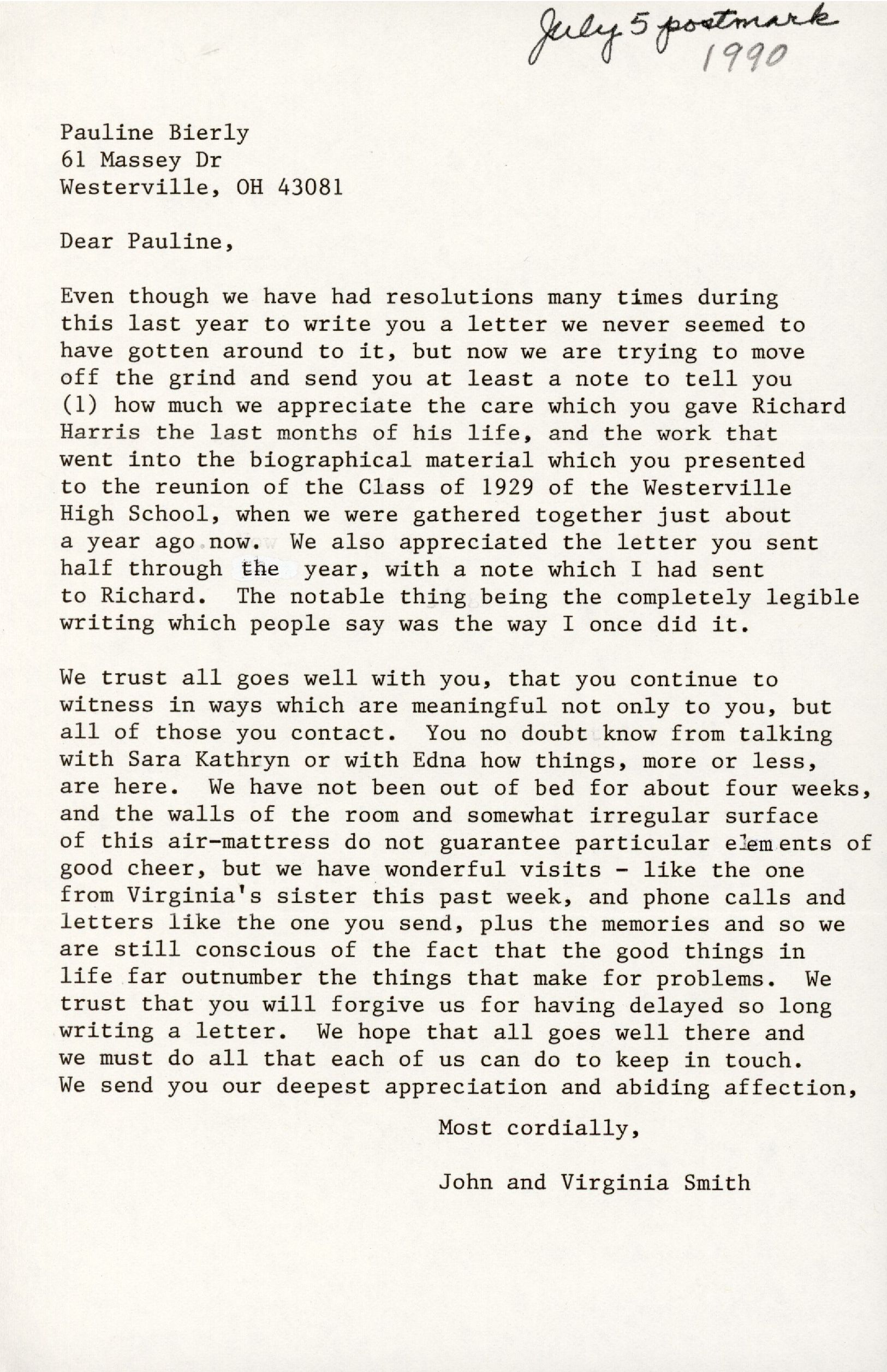 Even though we have had resolutions many times during this last year to write you a letter we never seemed to have gotten around to it, but now we are trying to move off the grind and send you at least a note to tell you (1) how much we appreciate the care which you gave Richard Harris the last months of his life, and the work that went into the biographical material which you presented to the reunion of the Class of 1929 of the Westerville High School, when we were gathered together just about a year ago now. We also appreciated the letter you sent half through the year, with a note which I had sent to Richard. The notable thing being the completely legible writing which people say was the way I once did it.