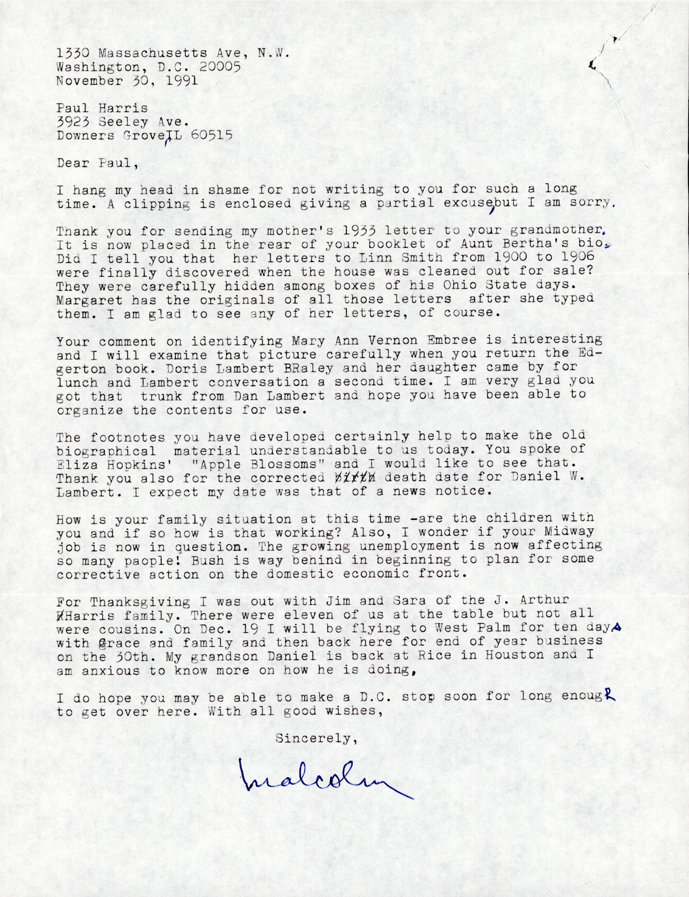 AU Smith, Malcolm Lambert - 1991-11-30 letter to Paul J. Harris Jr.Entry/Object ID