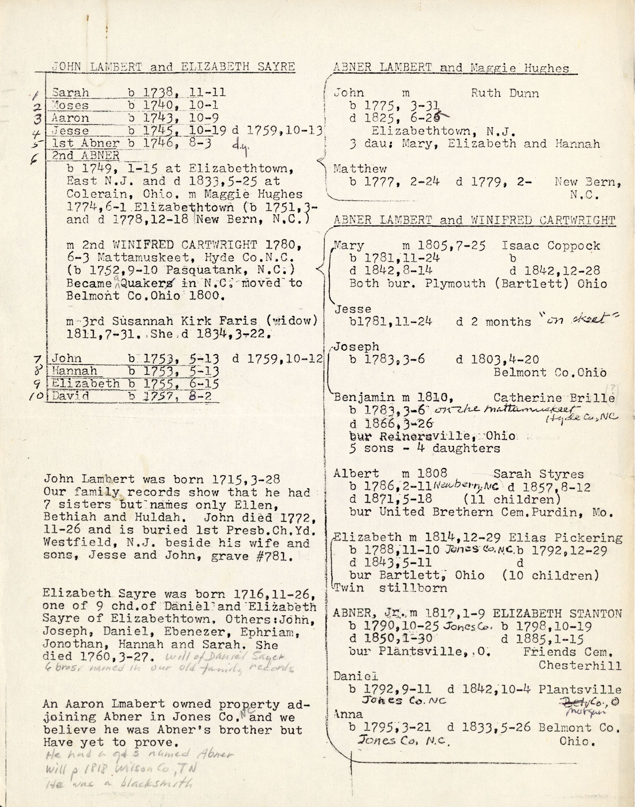 An Aaron Lambert owned property adjoining Abner in Jones Co. NC and we believe has was Abner's brother but have yet to prove. {He had a gd s named Abner, will p 1818, Wilson Co., TN. He was a blacksmith}