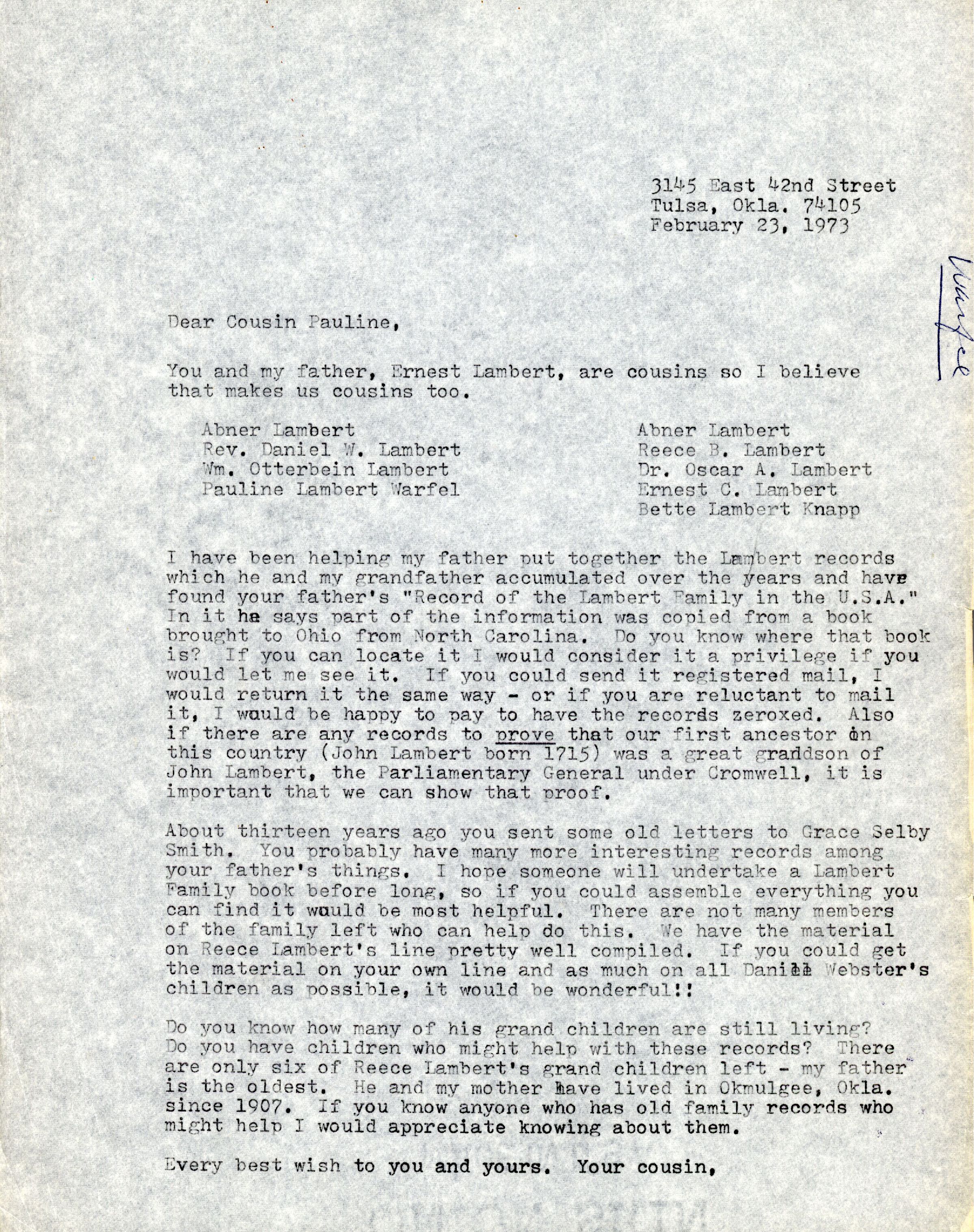 About thirteen years ago you sent some old letters to Grace Selby Smith. You probably have many more interesting records among your father's things. I hope someone will undertake a Lambert Family book before long, so if you could assemble everything you can find it would be most helpful. There are not many members of the family left who can help do this. We have the material on Reece Lambert's line pretty well compiled. If you could get the material on your own line and as much on all Daniel Webster's children as possible, it would be wonderful!!