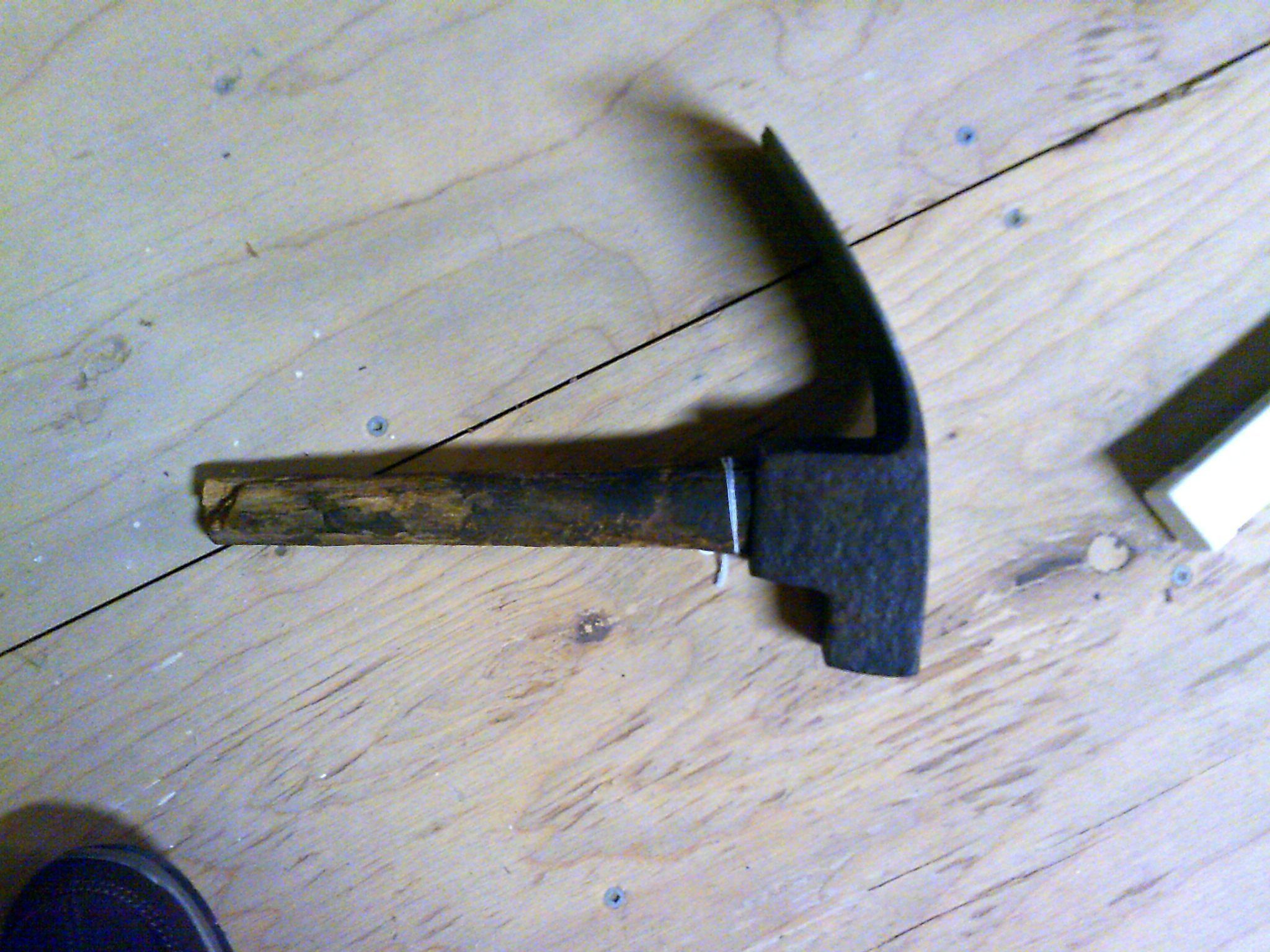 Wooden handle is cracked anf looks broken (as if it was longer). Metal is tarnished (possibly rusty). Head still connected to handle