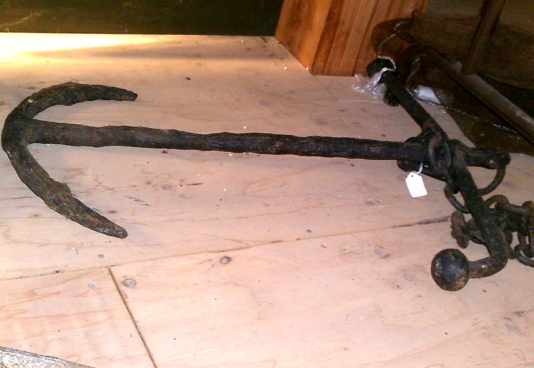 Ships anchor. Black in color. Typical anchor shape with heavy chain linked attached at top. Very heavy. Rust present throughout.