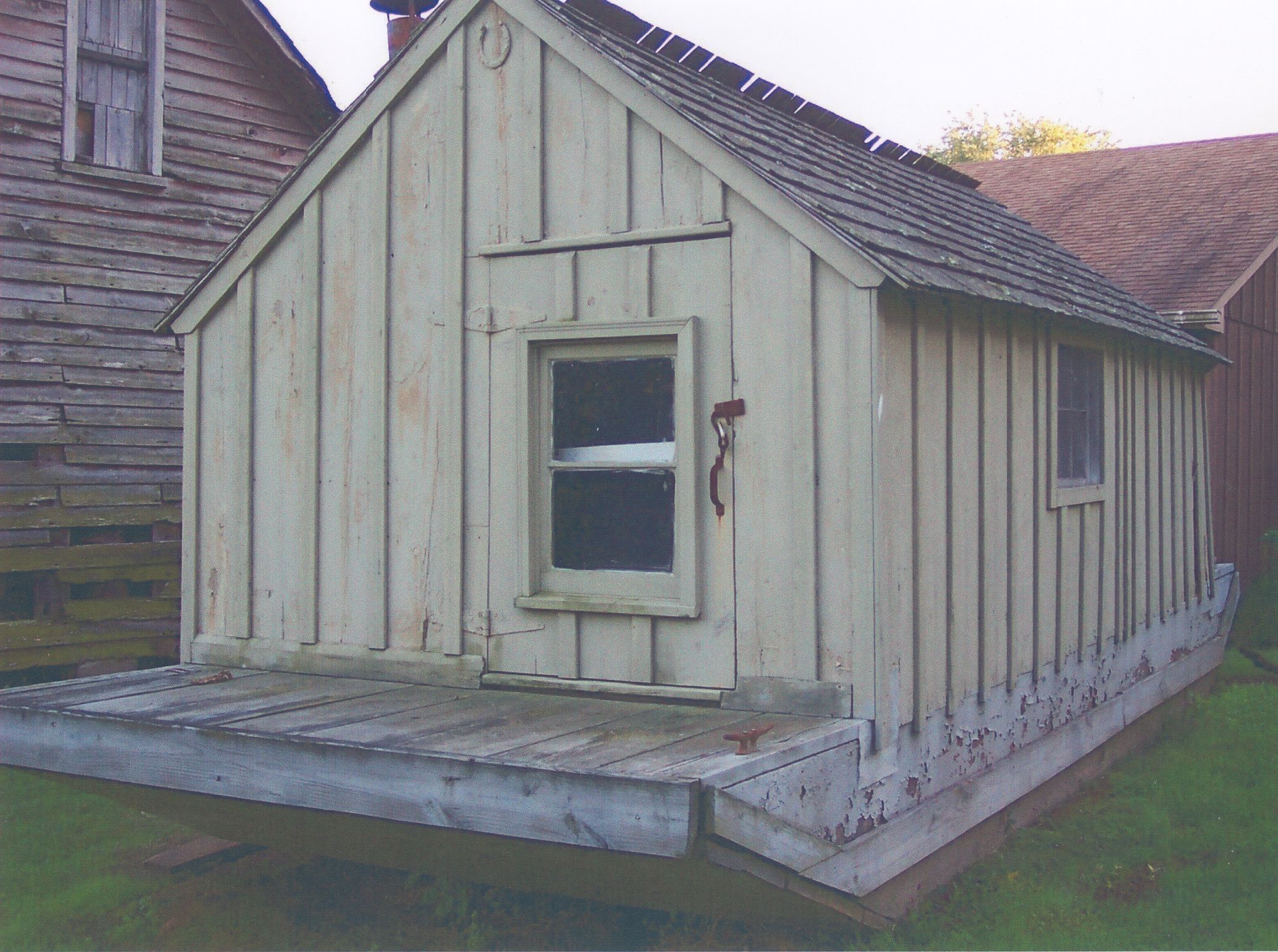 Shad shack that once floated on the water with a heavy scow bottom. Made of clapboard sides and wood shingled roof. Has a single, fixed six light window on both port and starboard. There is a small door at both stem and stern. It is a single room inside with a coal burning stove, white painted wood dresser and a bunk bed. Owned by Fritz Elliott who used it off the shore of Old Baltimore. When APG purchased the lands and waters of the area he moved the shack onto the property of the Boyers on the Bush River.Collection