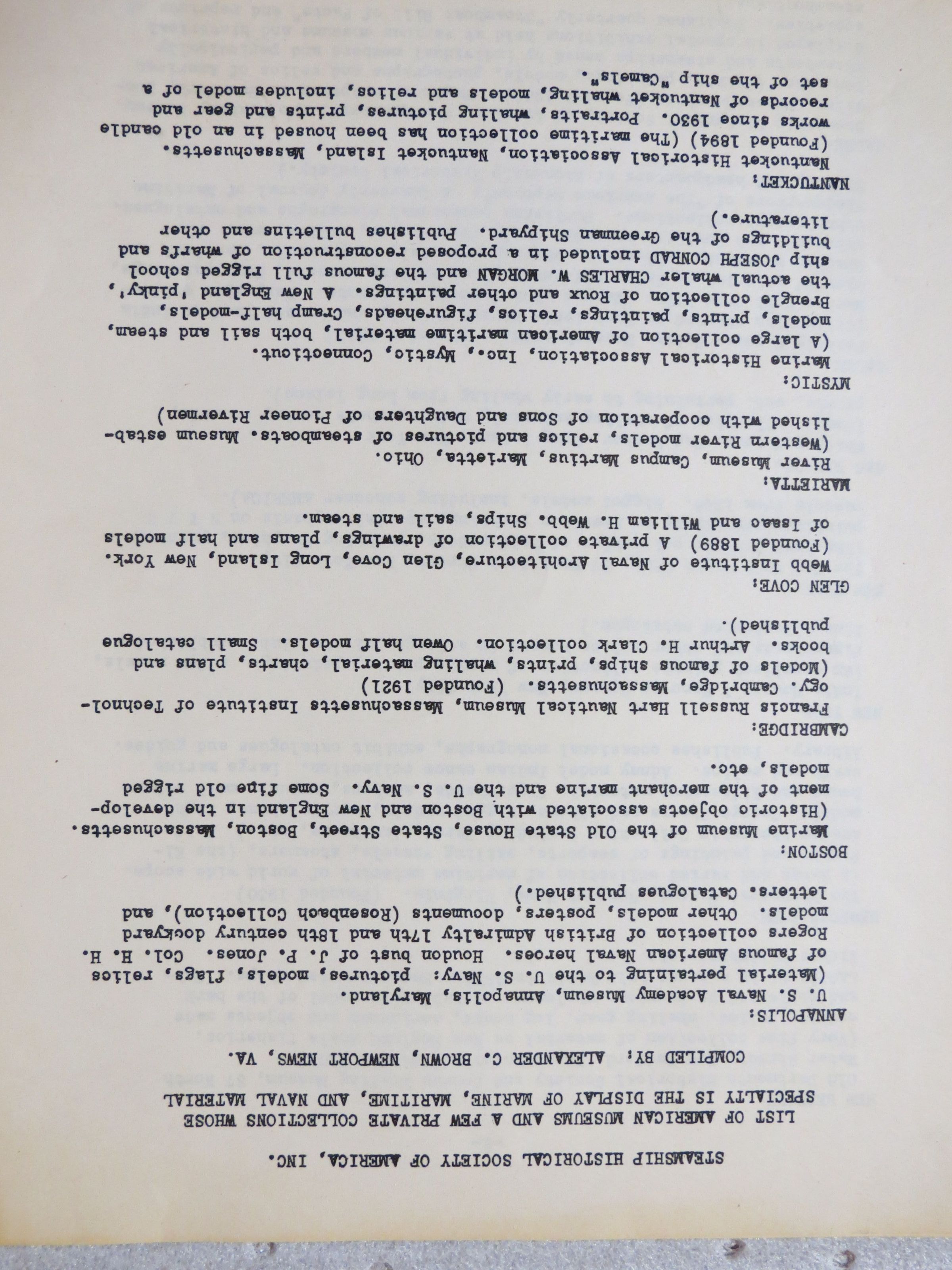 Steamship History Society of America, Inc.: List of American museums and a few private collections whose specialty is the display of marine, maritime, and naval material. Compiled by: Alexander C. Brown, Newport News, VA. Six pages.Collection