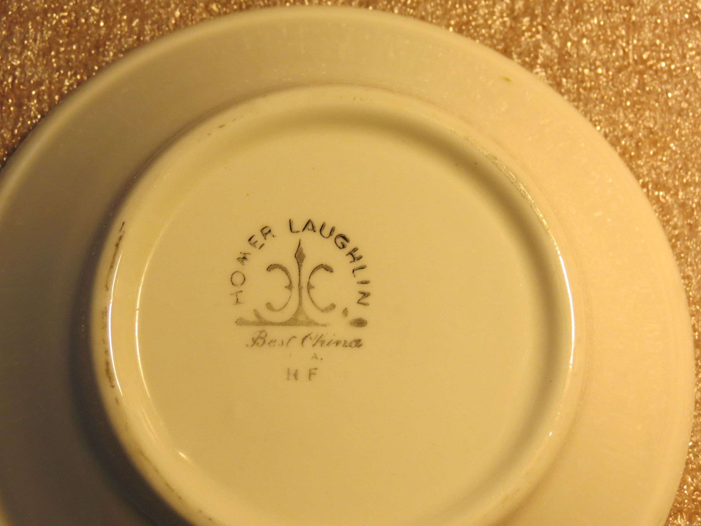 White porcelain bowl with two navy trim bands. Navy anchor decoration on bowl. Underside of bowl has inscription: "Homer Laughlin: Best China, U.S.A. (faded), HF).Condition