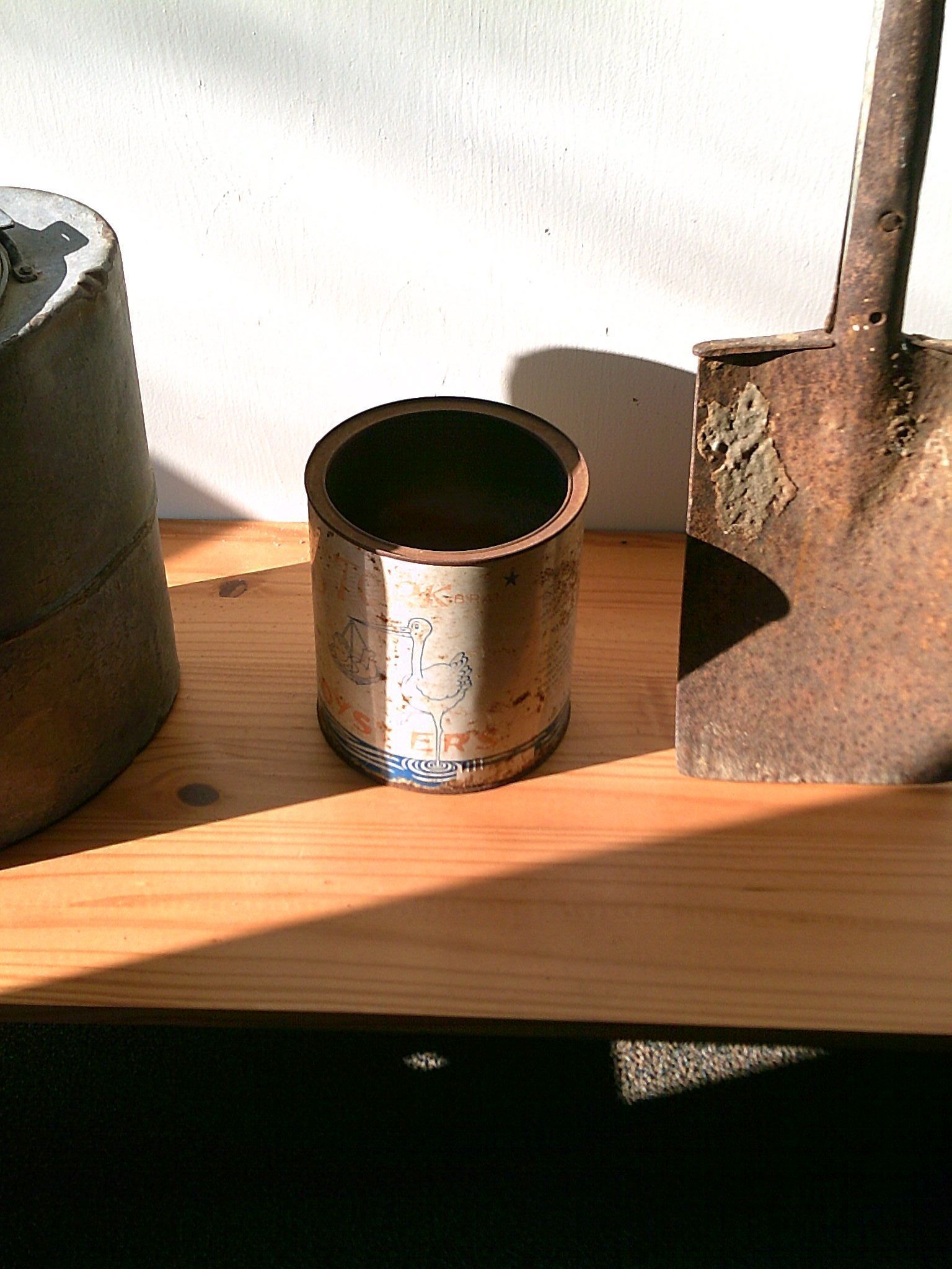 Is rusted in many spots: inside, on the lip, the can itself, and bottom. Picture is still noticable but some of the words are covered by rust you cant read them.