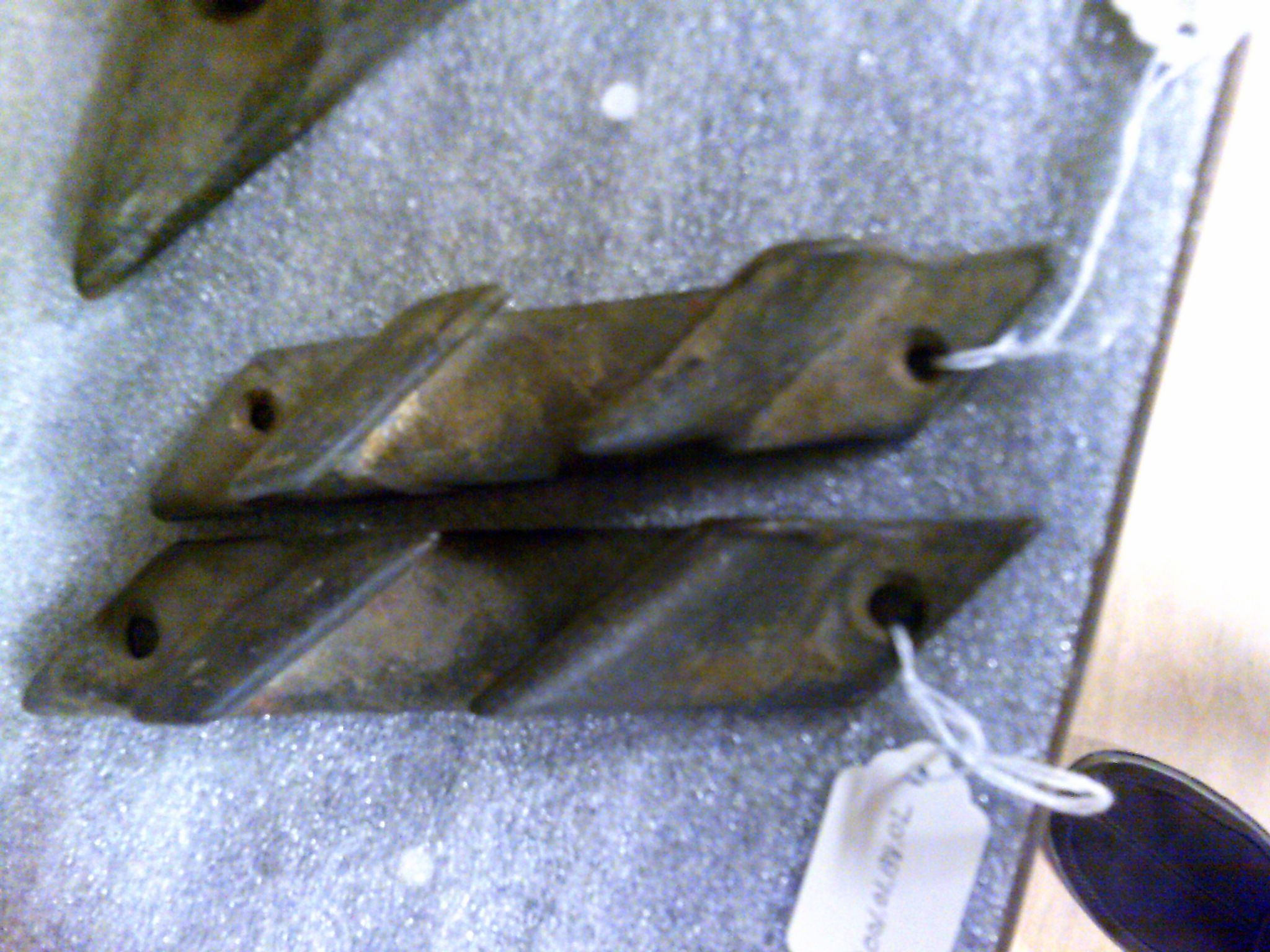 Chock made of heavy metal Rectangular in shape. Ends have triangular points. Two holes where screws would be to attach. Rounded cuping position coming up from bottom. Painted black. Used to keep line away from side of boat.Collection