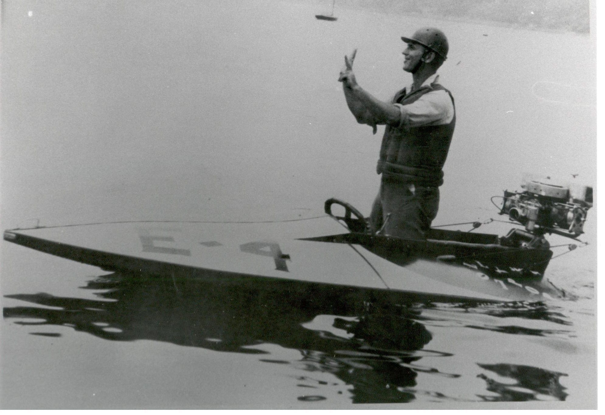Copy of the photograph of man in a boat weraing a helmet and life perserver, signaling to someone out of the picture. The man is Morton Daller, and the boat is the speed boat P4 "Lollypop" probably taken at a raceCollection