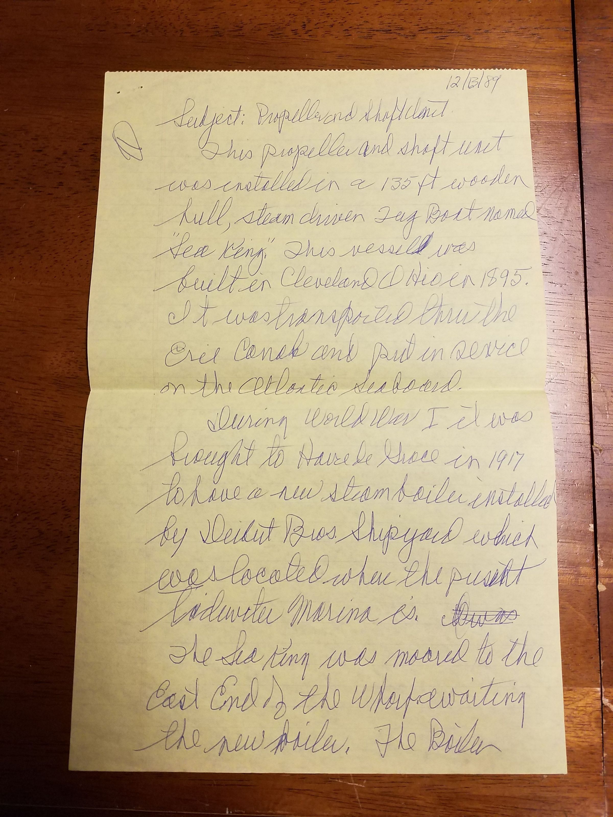 This propeller and shaft unit was installed in a 135 ft wooden hull, steam driver (JAY Boat??) named "sea king". This vessel was built in Cleveland Ohio in 1895. It was transported thus to Reri Canal and put in service on the Atlantic Seabound.