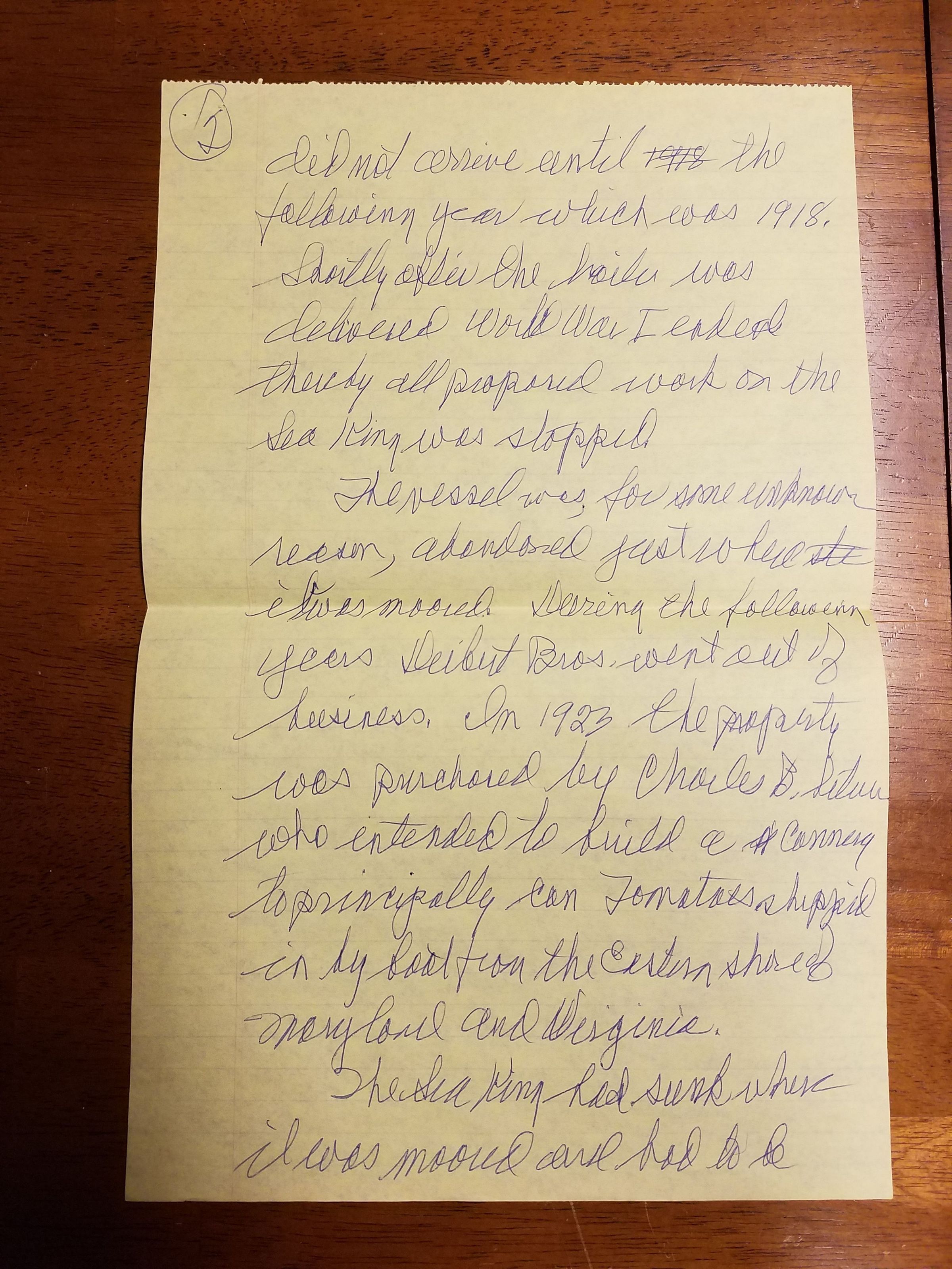 The vessel was for some reason abandoned just (nowhere else moored??) during the following years Deibut Brothers went out of buiness. In 1923 the property was purchased by Charles B Silver who entended to build a cannery to principally can tomatoes shipping by boat from the Eastern shore of many (home and Va)