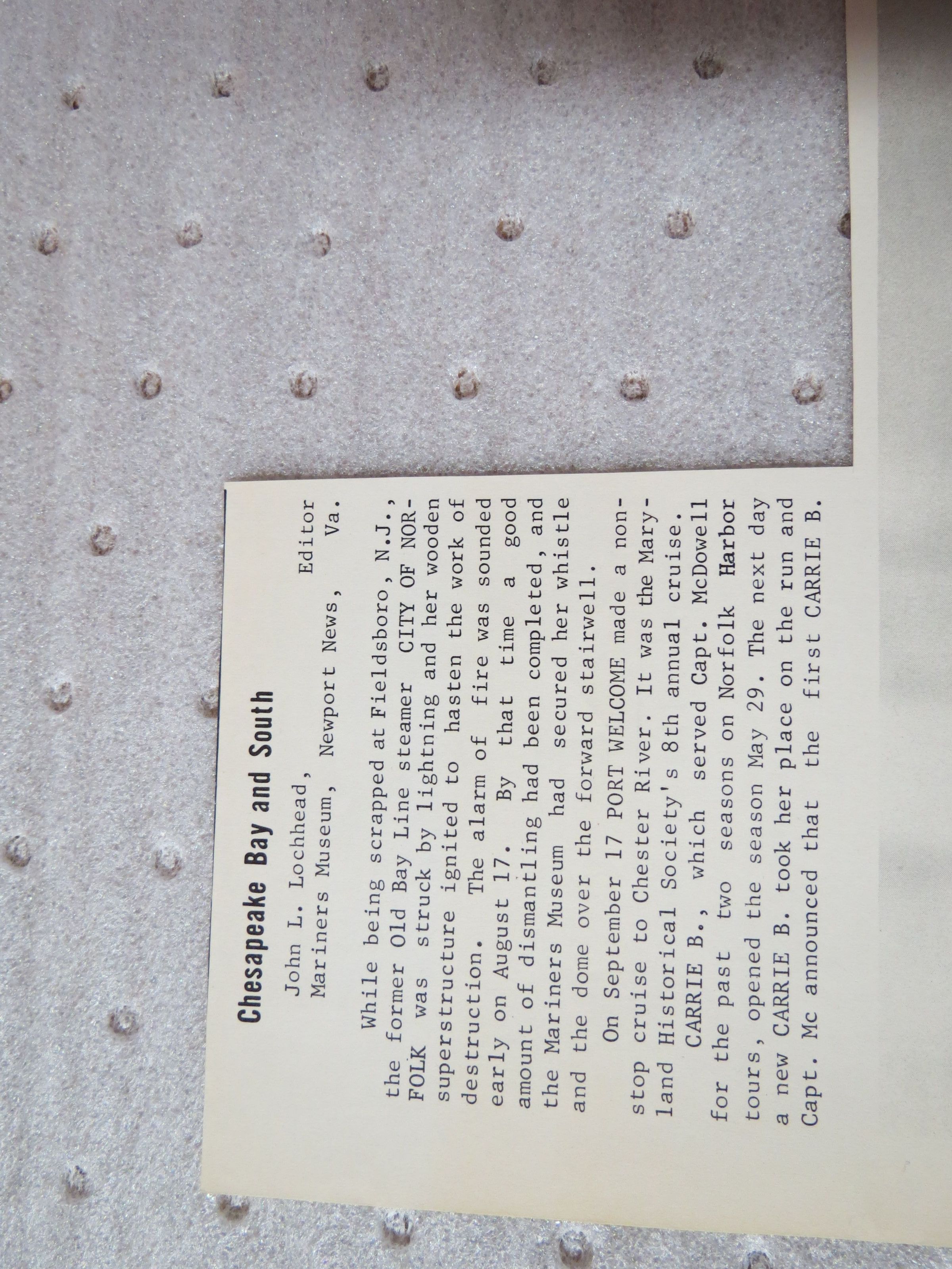 Newspaper or newspaper scrapbook excerpt. Includes black and white photograph of City of Norfolk. Text referenced to John L. Lockhead, Mariners Museum, Newport News, VA. Photo caption notes City of Norfolk leaving Baltimore for the last time, photo courtesy of Maryland Port of Authority.Collection