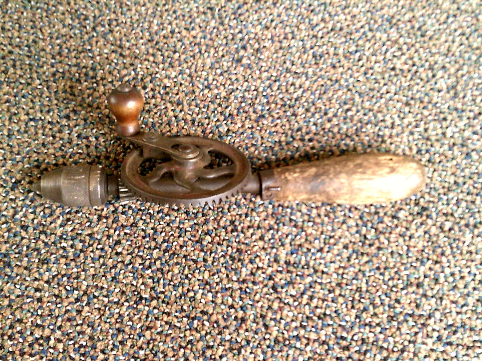 Hold vertically, one hand on the handle at the top whilst the 2nd hand rotates the other handle in a clockwise direction. This turns the chuch and drill bit. Light pressure should be applied, if to much pressure is used the drill bit could break. Hand Drills are used for drilling a range of sizes of holds. Larger drill bits are called 'fostner bits' and ' auger bits.'Collection