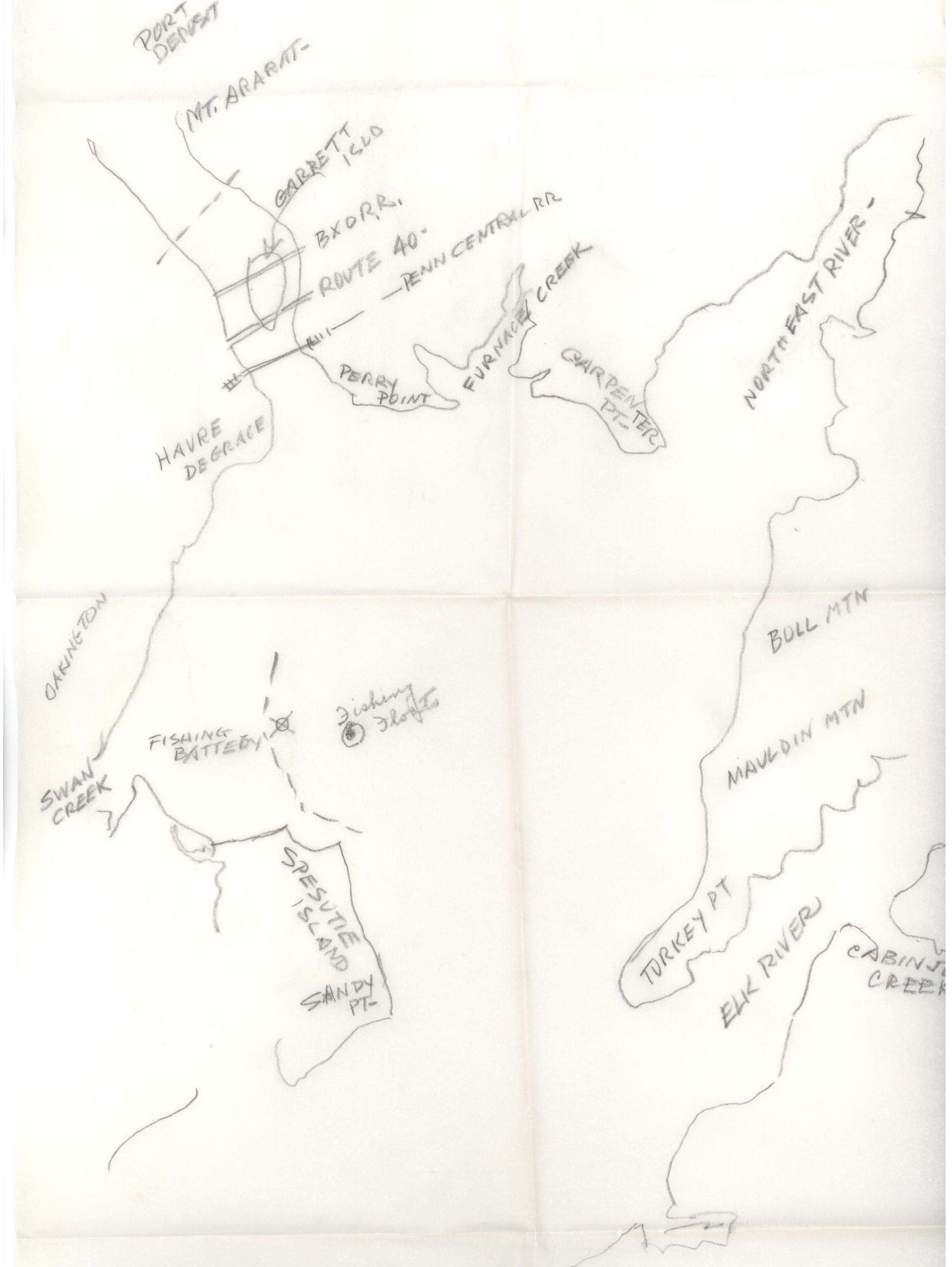 Handdrawn map of the upper cheseapeake bay. Drawn by Jm. Smith Michael on typewritter paper. Osborne Michael and Jm. Smith Michael were avid boaters of the area.